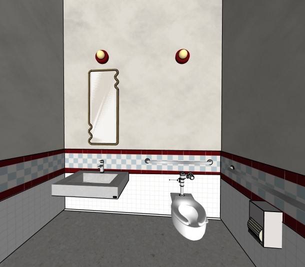 no windows present completely eliminate all natural light no sunlight no daylight no exterior glow use only artificial lighting sources any natural light in the scene is incorrect light fixtures are red maintain the exact tile color and tile dimensions from the original image without any changes keep all existing light fixtures unchanged in design position and color do not modify materials colors or lighting conditions