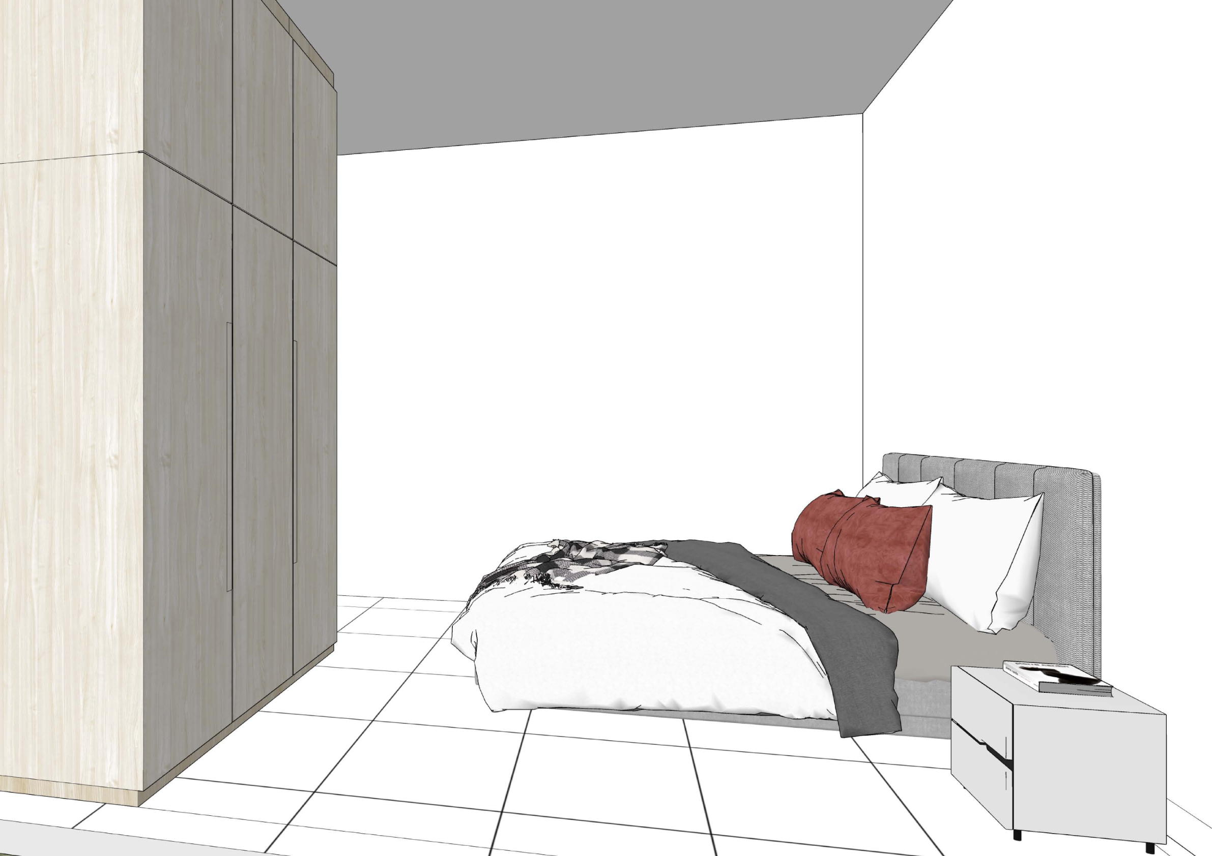 realistic architectural interior render of a modern minimalist space of a house keep the exact original layout proportions furniture placement materials and camera angle no redesign no added or removed elements clean contemporary aesthetic with soft neutral color palette realistic shadows real life material textures physically accurate materials pbr textures correct reflections subtle glossiness variation soft ambient occlusion global illumination ray traced lighting realistic camera lens 35mm eye level perspective correct scale and depth clean styling minimal clutter photorealistic interior photography high dynamic range sharp details natural color grading architectural digest style compact modern minimalist bedroom with light wood wardrobe on the left side upholstered grey bed with soft fabric headboard white bedding with layered pillows including a rust accent bolster dark grey throw blanket small bedside table on the right white tiled floor and plain light colored walls