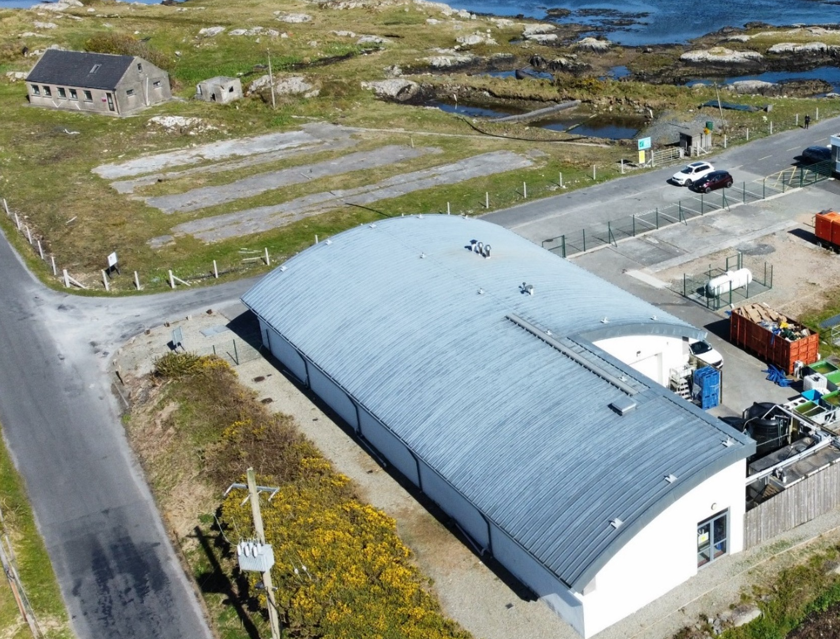 photorealistic architectural render of a marine research and innovation centre in carna connemara on the west coast of ireland the facility comprises two refurbished buildings a larger marine innovation and development centre research building with a distinctive curved barrel vault roof white rendered walls dark charcoal or black curved roof cladding and large industrial windows and glazed entrance on the front facade a smaller compact single storey administration building sits adjacent the site is a flat concrete yard with the atlantic ocean and connemara coastline visible in the background rocky shoreline sparse coastal vegetation soft overcast irish atlantic sky seawater infrastructure and pipework visible in the yard the building feels industrial coastal and purposeful a working marine science facility in a remote gaeltacht landscape render strength 90