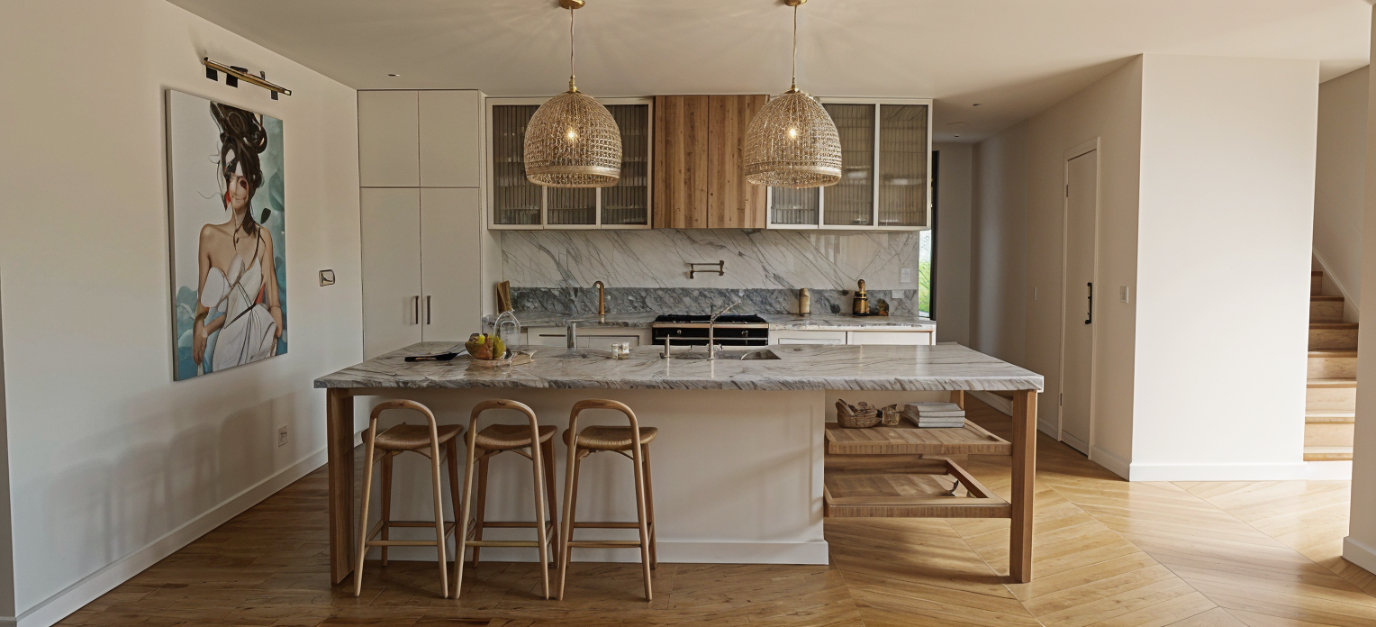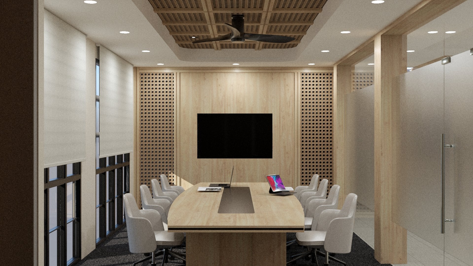 render a modern conference room with an elegant and sophisticated atmosphere the walls are light beige with wooden accents in light oak the ceiling features recessed lighting and a sleek black fan the central table is made of light oak with a black inset surrounded by plush white chairs the room is softly illuminated showcasing a large black screen on the front wooden panel the floor is carpeted in dark charcoal adding a sense of luxury glass walls on the side are frosted for privacy with a minimalist chrome handle on the door natural light filters through tall windows with white blinds enhancing the calm and professional environment