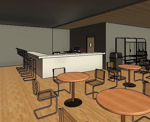 smoothie shop circle ceiling lighting half wood ceiling all colorful chairs very tall tables worker behind counter drink cooler beside counter colorful swirls on walls