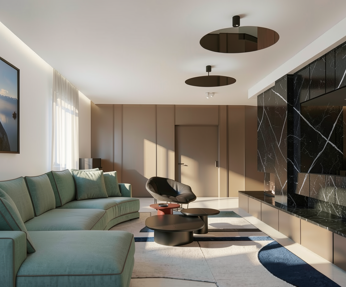 same but background inside room with beton floor and wall window in back with view on a f1 racing circuit we are on second floor
