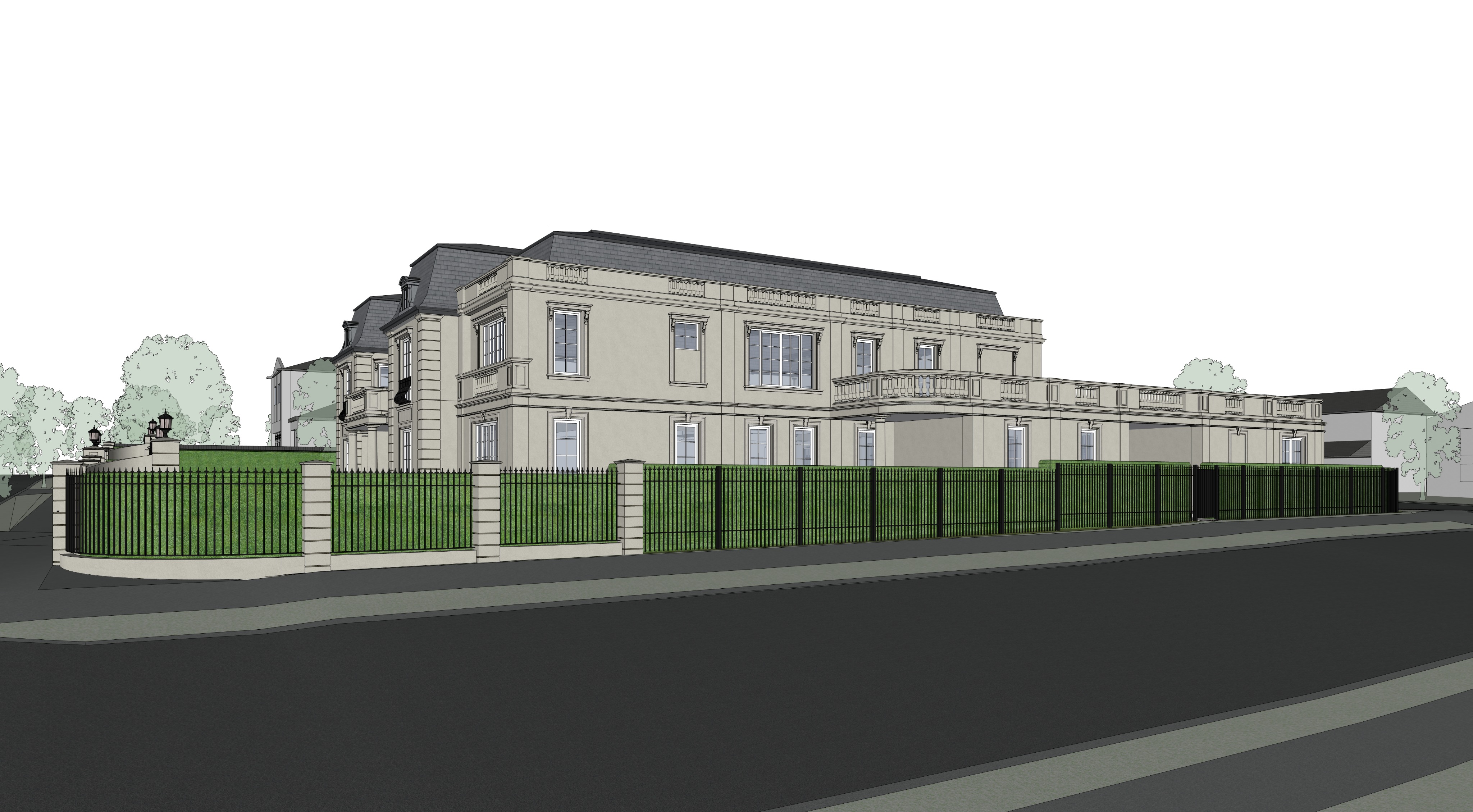 photorealistic render canon eos 5d classical home high green hedges fence dramatic lighting award winning at dusk contrast slate roofing wet road diffused light on the curated objects within which reflect a blend of natural textures the composition should be balanced and serene evoking a sense of high end artistry with subtle reflections of the internal light the overall image should be sharp exquisite detail from the texture of the building materials to the softness of the light glow