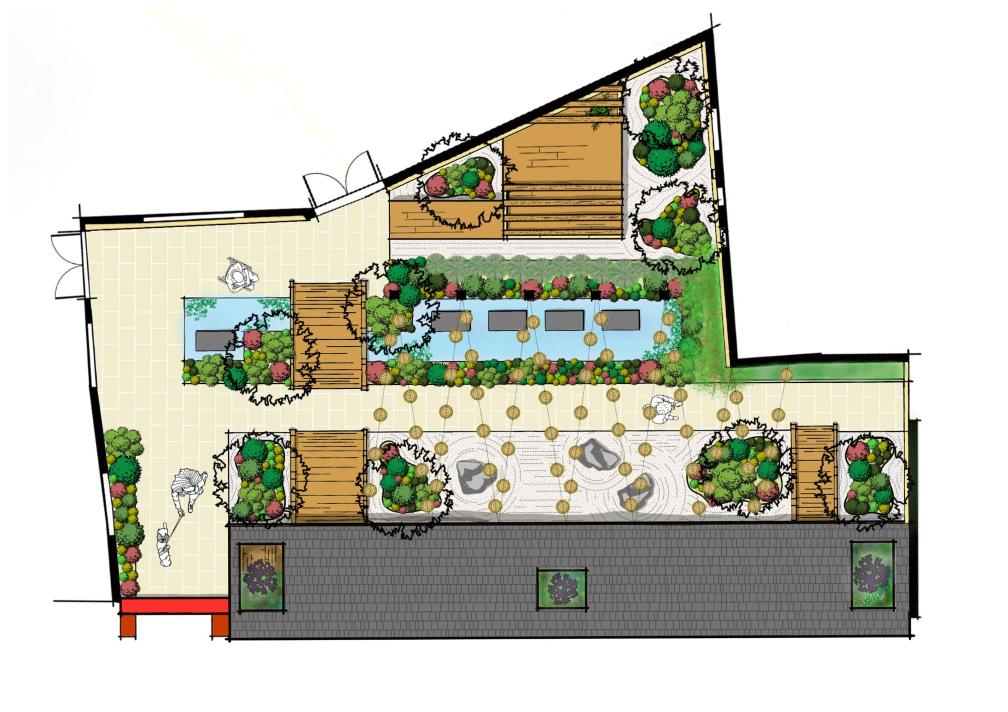 this is a top down view of a japanese garden design make the image photorealistic and add shadows