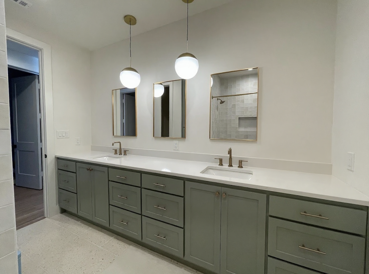 render the scene in a bright modern style with light coming in from the windows and under0counter lighting the cabinet handles are brushed nickel