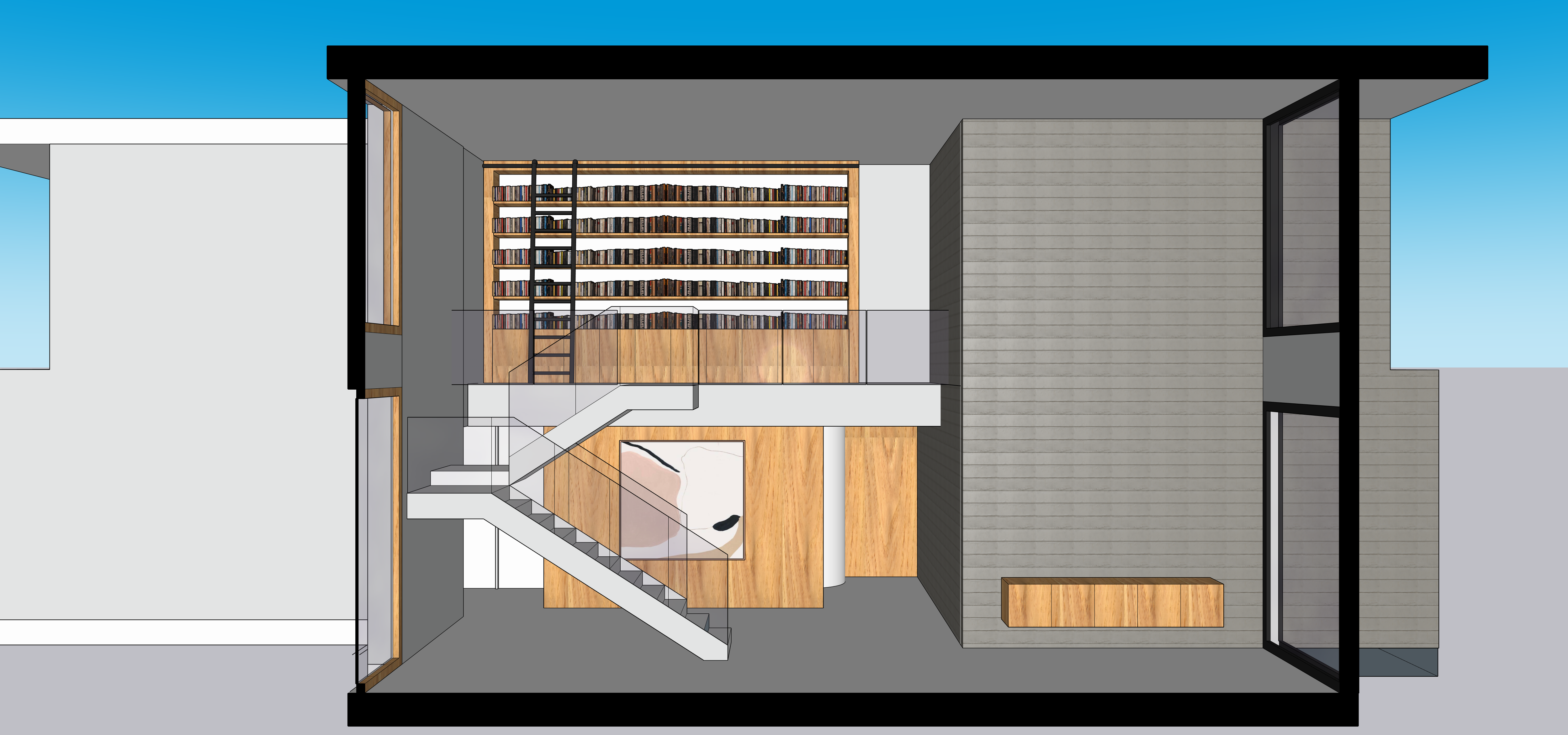 render this view into a photorealistic architectural render style floors should be in a light beige large natural stone tiles add 3 planters with plants under the stairs and one planter to match on the right side of the top floor hallway in front of the library do not add any planters anywhere else only add planters where specified under stairs and top floor