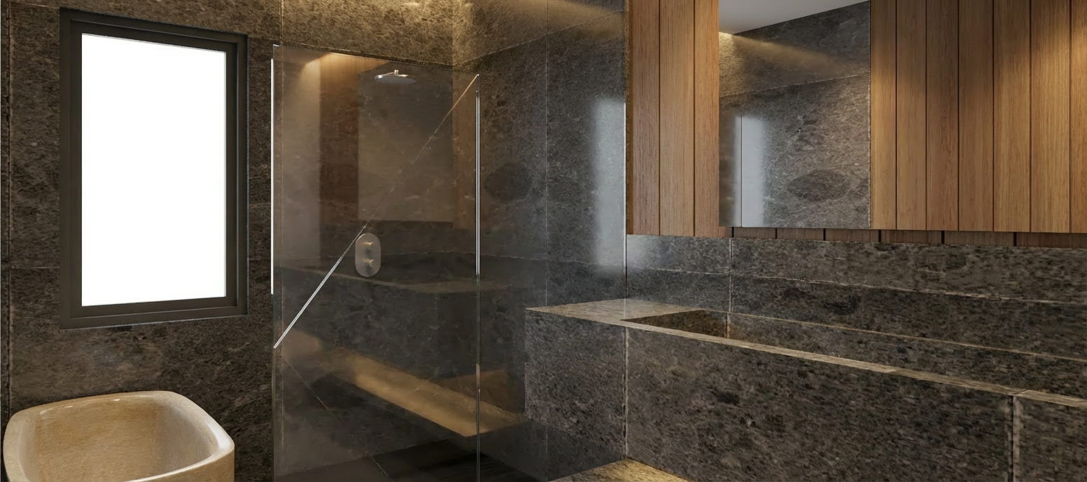render realistic using white stucco with mixed brown color stone and black windows black accents black doors and black roofs set this is a residential neighborhood with large mature trees and very upscale landscaping provide shrubs and landscaping around the base of the house do not add any other additional structure to the house make the surround of the front door black and make the time of day dusk with lights do not add any other masses to the overall size of the house add outdoor lighting next to front door and lighting in the soffits
