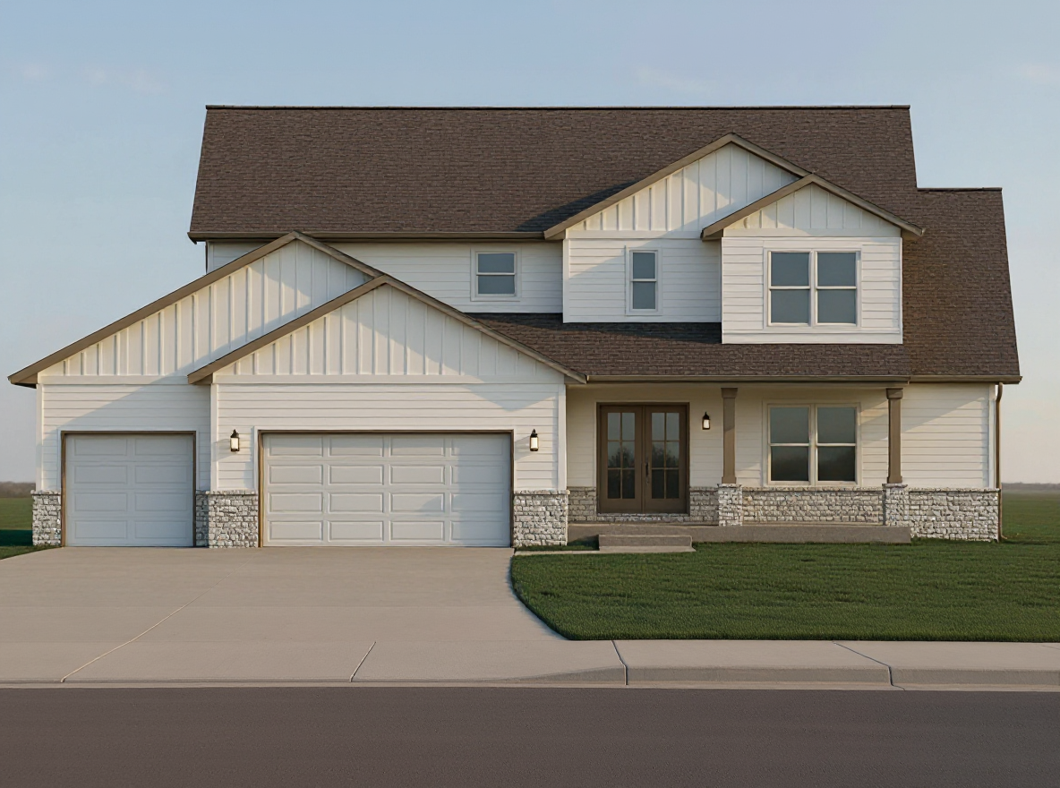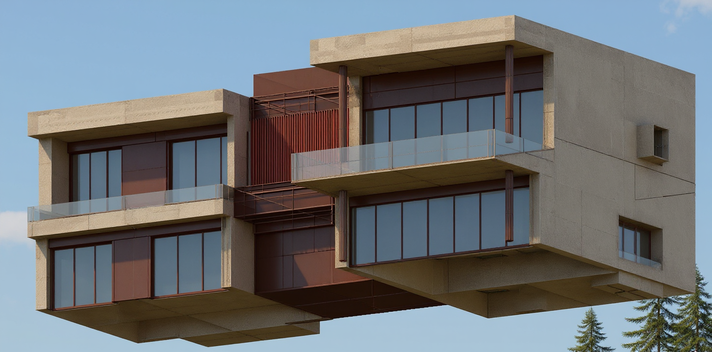 exterior shot the light brown color represents beige plaster the dark brown represents corten steel sheet metal the red in the central volume would be metal latticework also in dark corten steel and the blue would be glass i want the style of the image to be realistic i want a blue sky and pine trees to appear in the background
