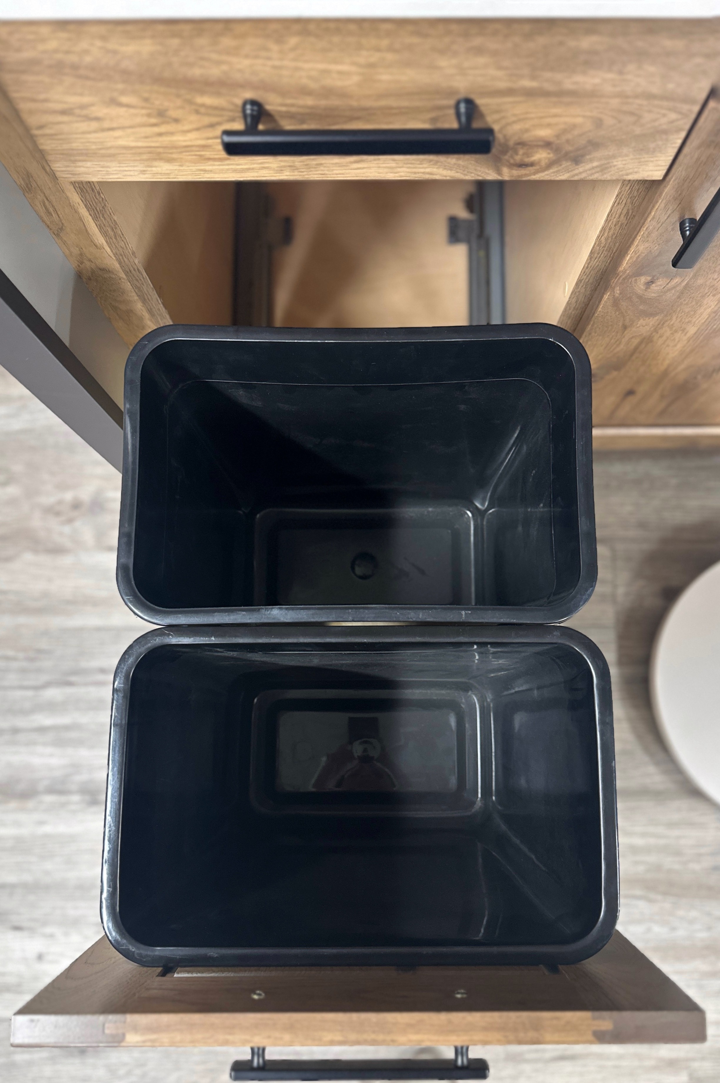 add more natural light change the flooring remove the white circle on the right get rid of the black and grey wall on the left stage the trashcans with clean bags