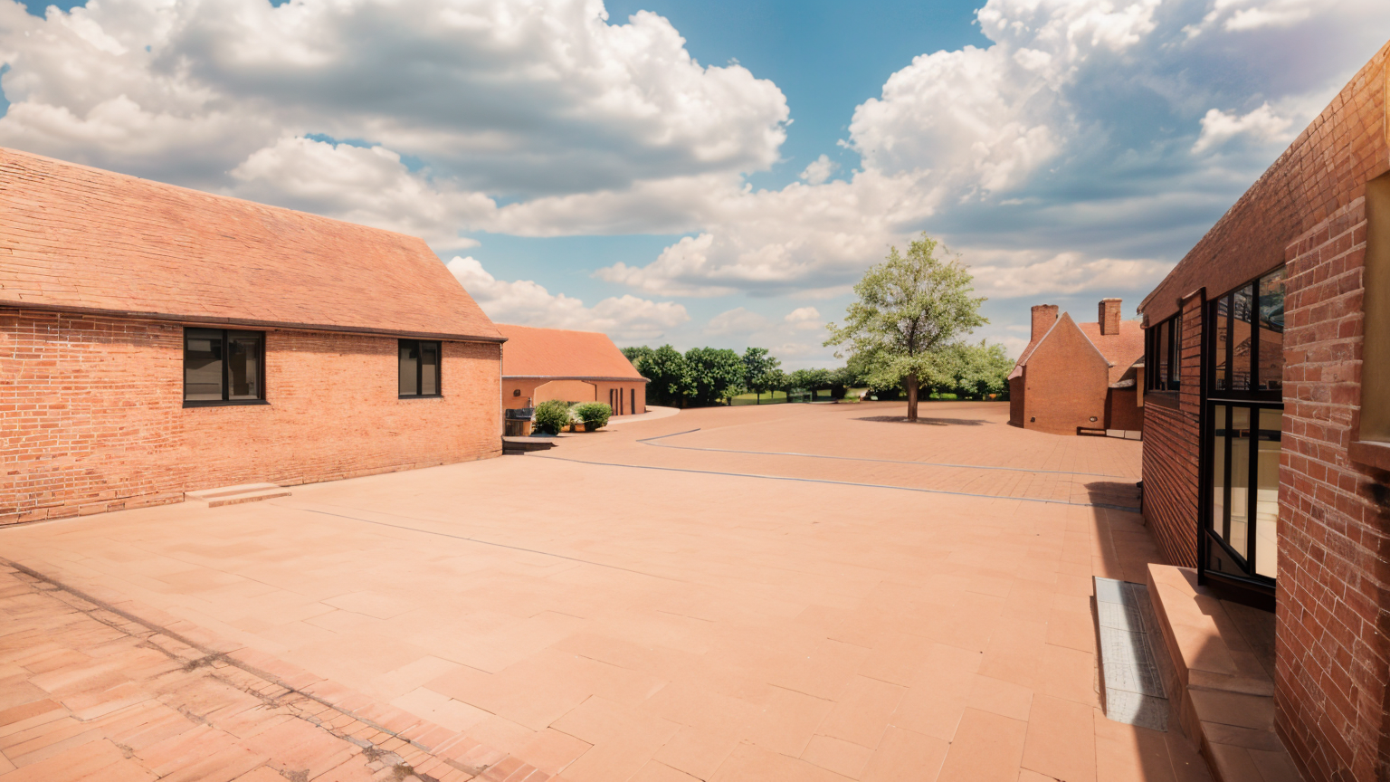 exterior shot modern gas station with lots of green trees around it some elements of wood in the building