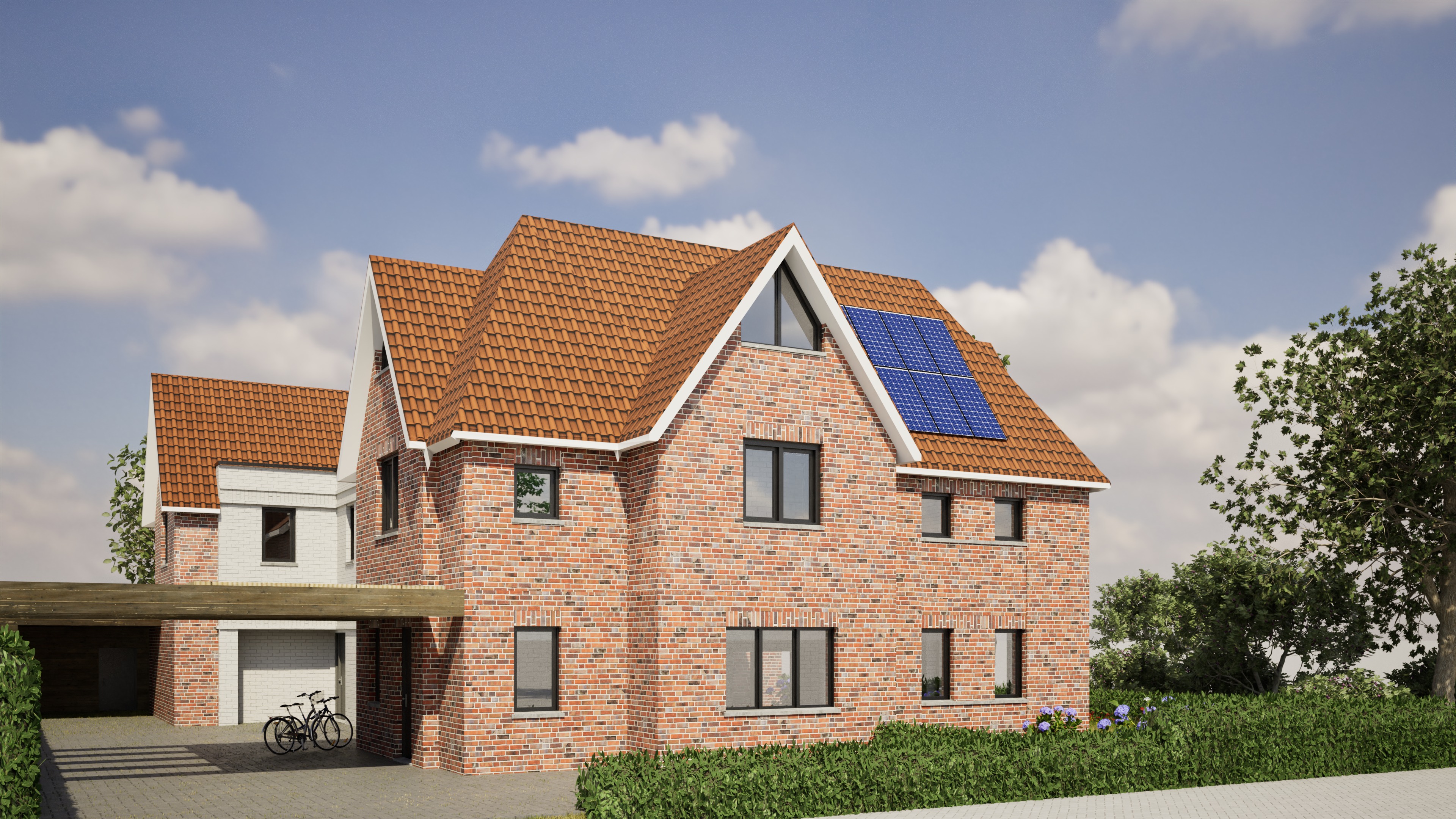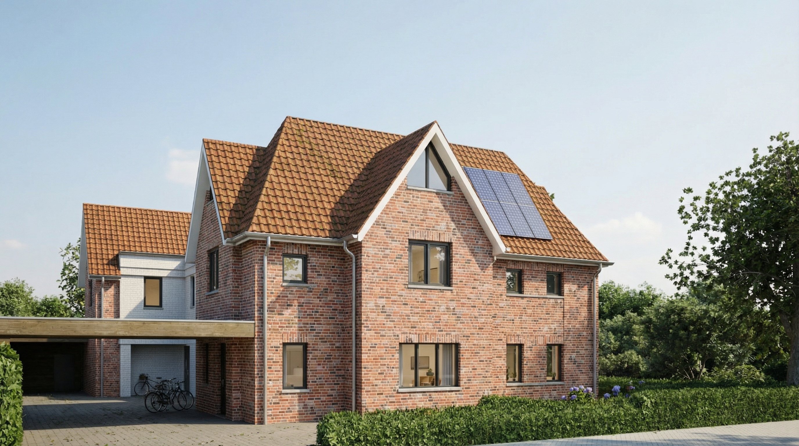 transform this rendering into an ultra photorealistic architectural photograph shot in bright summer atmospheric light preserving the exact geometry materials colors and composition from the original image enhance only real world material behavior natural reflections roughness variation subtle imperfections apply physically accurate daylight soft shadows realistic global illumination professional architectural photography look with a 35 50 mm lens straight verticals natural exposure no cgi look indistinguishable from a real photo correct slight errors in the rendering and display the clinker textures seamlessly the white facade consists of white painted clinker background on the right with trees bottom left foreground with pavement realistic glass through which interior space can be seen slightly add gutters and downpipes made of zinc discreetly lighting from the viewer s perspective not from the right downpipes only in inner corners