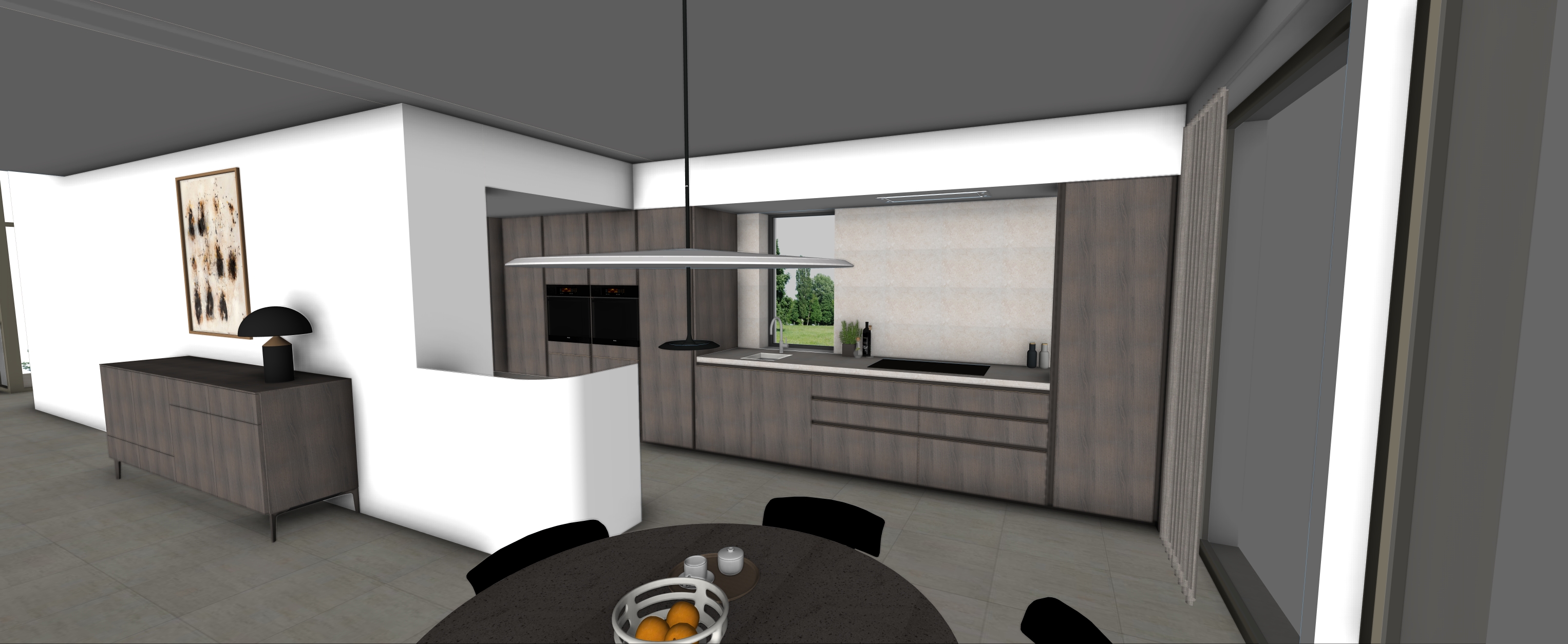 realistic interior shot natural warm daylight garden as background keep materials and proportions light grey brown oak kitchen