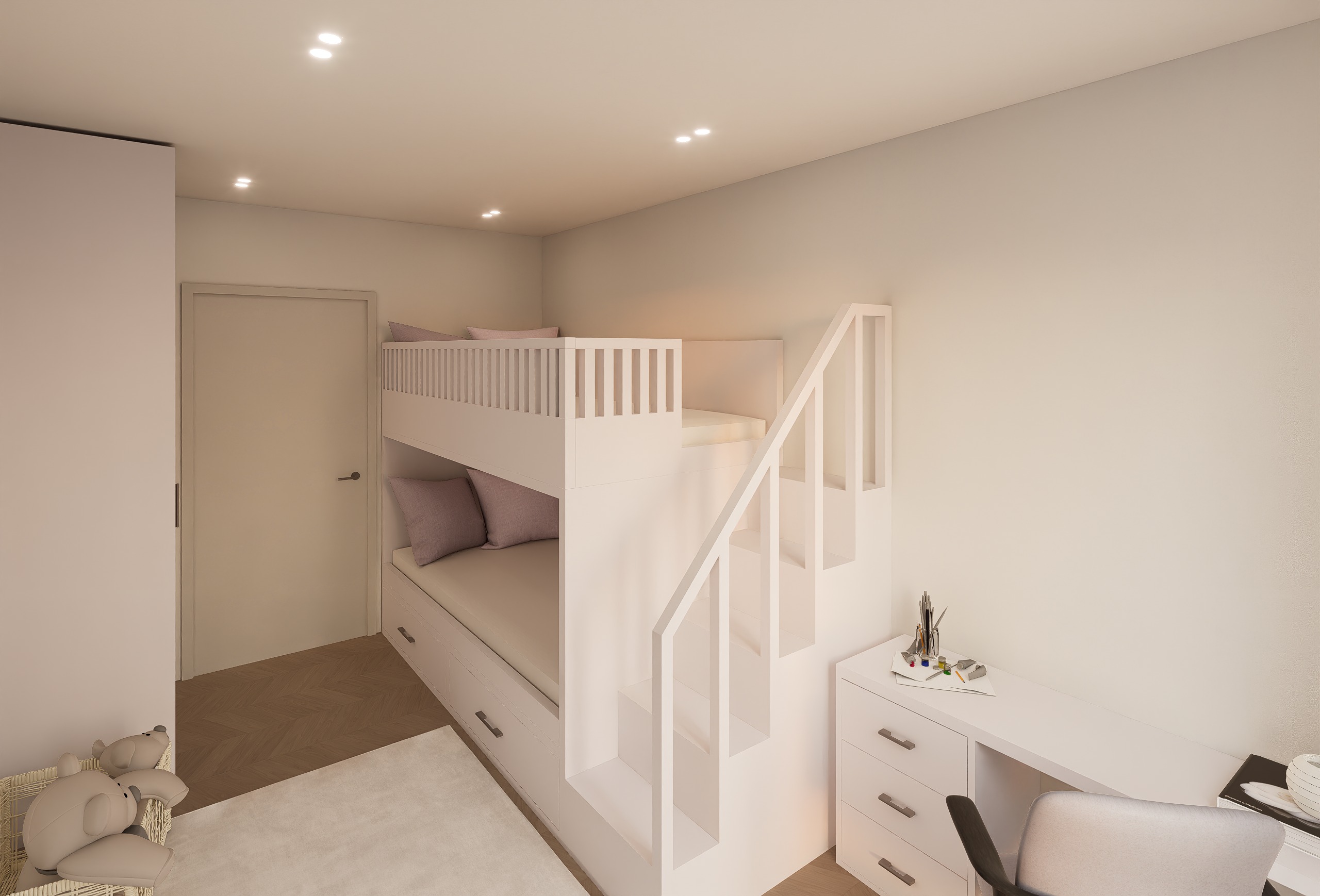 ultra realistic interior render keep exact same design layout proportions and camera angle do not change any geometry furniture placement framing or perspective do not move the camera materials bunk bed in matte painted wood off white with subtle surface texture soft edges and slight tonal variation mattress and cushions in soft fabric with visible textile grain natural compression and realistic folds pillows slightly asymmetrical with natural wrinkles desk and drawers in matte lacquer finish with soft reflections and slight color separation from walls chair with fabric upholstery and matte base with realistic material definition walls in warm beige matte paint with subtle micro texture floor in natural oak wood with visible grain and tonal variation rug in soft neutral fabric with slight irregular texture decor and desk objects with realistic materials paper wood metal lighting soft natural daylight entering indirectly creating smooth shadow gradients warm ceiling spotlights 3000k with realistic falloff and subtle glow increase shadow depth under bunk bed and stairs add slight uneven light variation on walls to avoid flat look balanced natural and artificial light environment minimal but realistic slight imperfections in fabrics and objects avoid perfectly clean surfaces style ultra photorealistic high end interior photography soft contrast natural imperfections 8k global illumination ray tracing strictly preserve original design no color deviation no perspective change