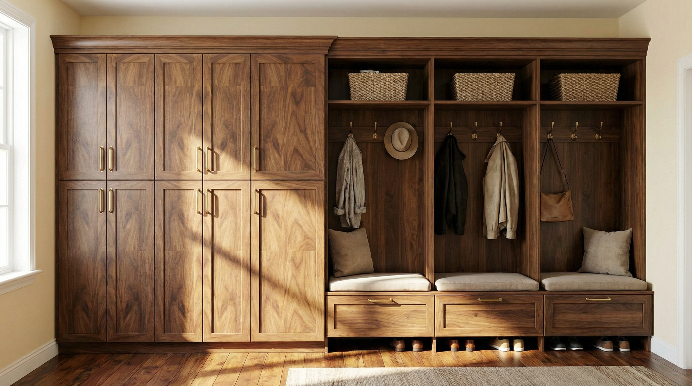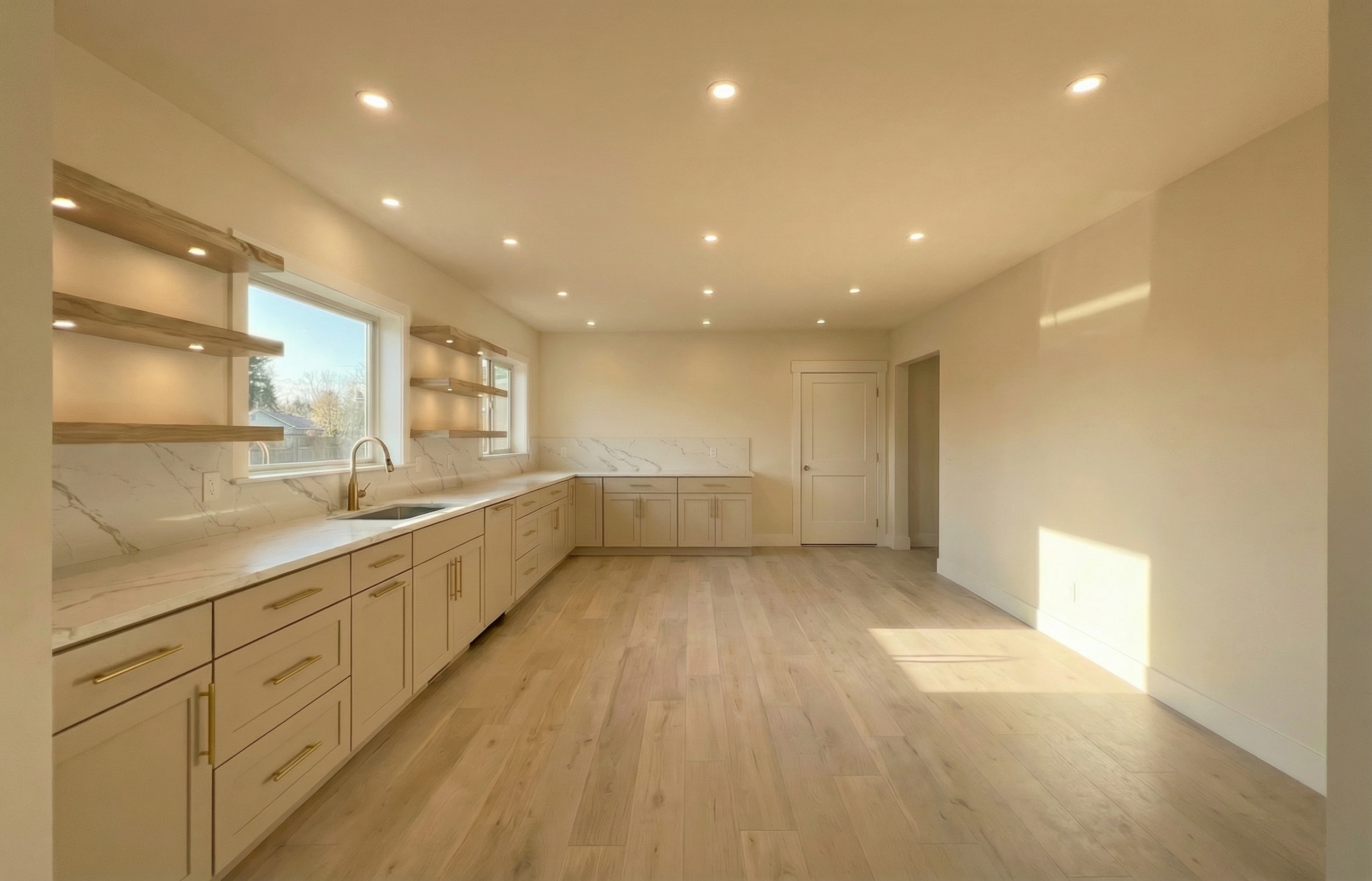 add a large opening on the farthest wall behind the counter add a dining room with windows on the same side as the other windows but not visual in the image do not add any furniture keep the room empty do not remove the door or alter any other openings do not add or change anything else