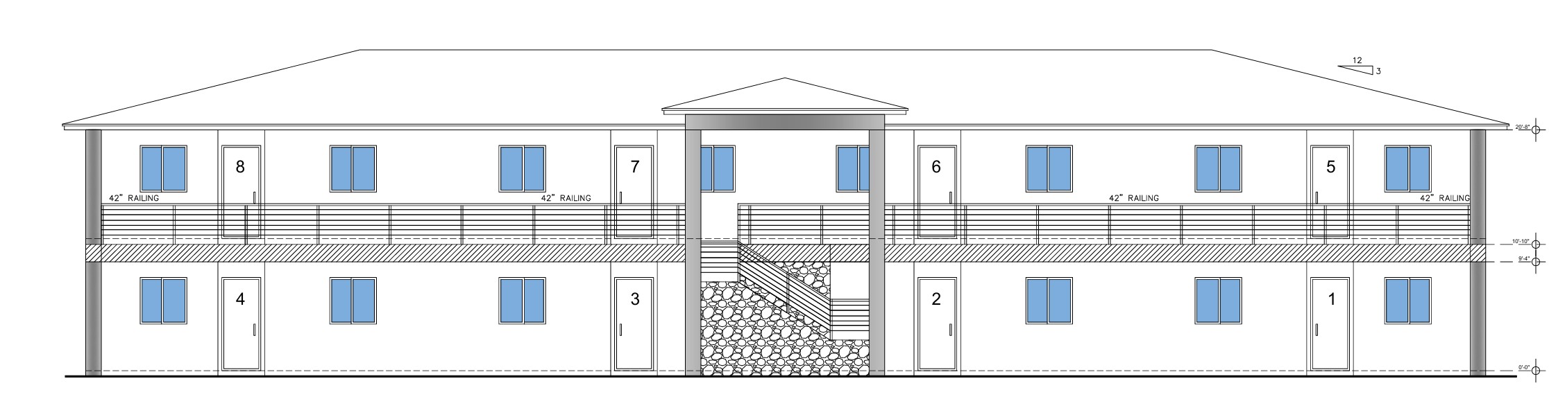 modernist exterior shot render a modern apartment building with a symmetrical facade featuring two levels with multiple doors and windows the building should have a light yellow exterior with light gray accents on the railings and columns the windows are large framed by a soft blue tint reflecting a clear sky the stairs and central columns are highlighted with textured stone in varying shades of gray metal seam roof the atmosphere should be bright and welcoming capturing the serenity of a sunny day with subtle shadows for depth and dimension florida style landscaping with palms architecture