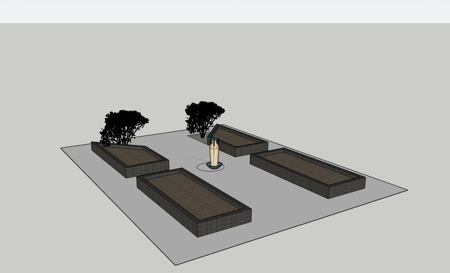 modernist exterior shot planter boxes and a central vase water feature the planter boxes are blasck wood with rich earthy brown soil surrounded by lush deep green foliage the central sculpture is a smooth metallic silver with subtle rainbow reflections hinting at a futuristic design warm sunlight casting soft shadows creating a harmonious and inviting environment the ground is a smooth light gray cobblestone that complements the overall peaceful aesthetic architecture