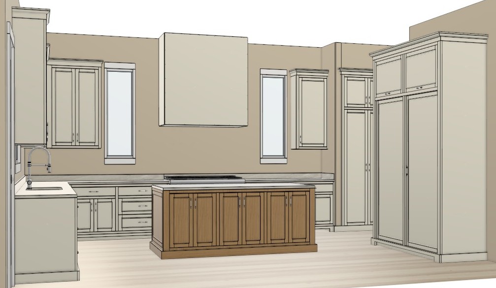 the island if rift white oak the cabinets are white dove the hardware is brushed brass the back wall and the hood have a decorative tile