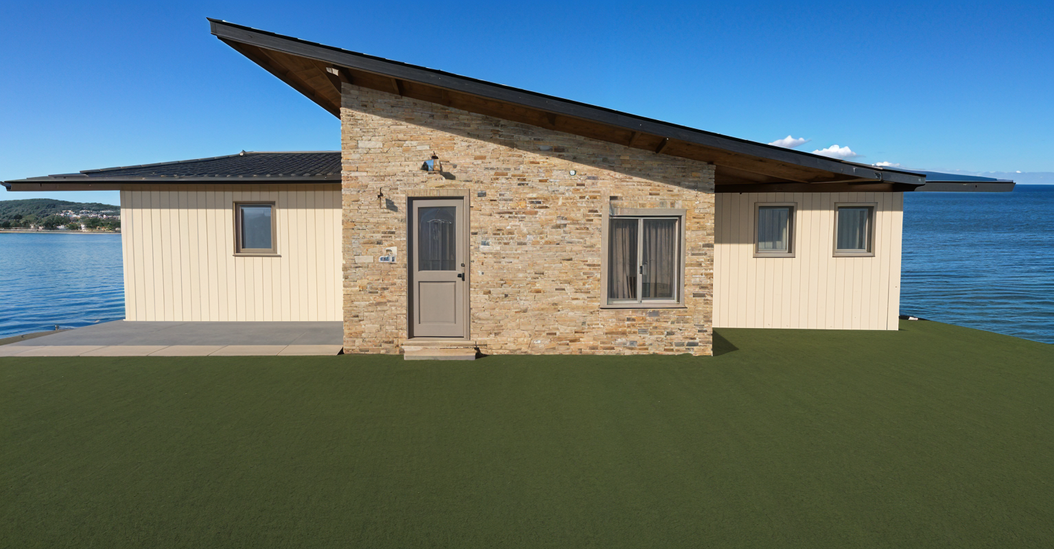 render a photorealistic 3d perspective of this house near sydney reference the current material style and enhance them white metal roof linea fibre cement cladding and sandstone walls keep model geometry the same windows doors roof walls garage door pavement driveway make a lush vegetation that looks native to australia do not change the view only enhance the current materials and make the landscape nicer vegetation detailed textures in the grass and glass reflections and a vibrant clear sky with light atmospheric depth render in hyper realistic architectural visualization quality 8k resolution