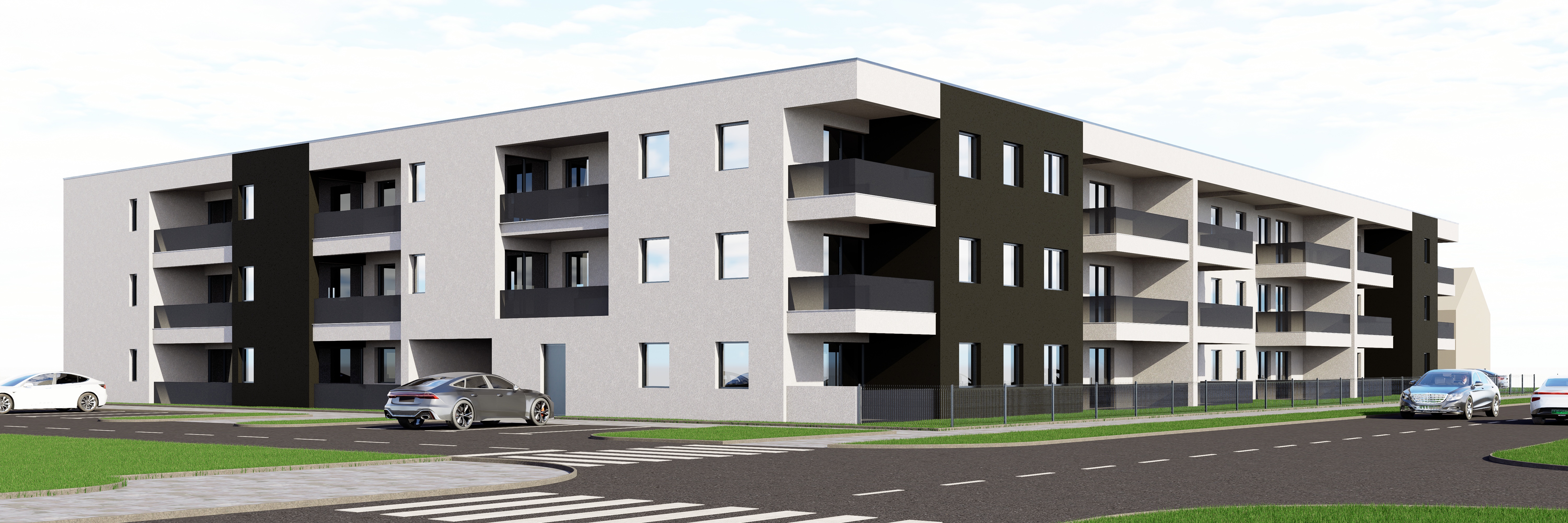 create a modern apartment building with a sleek minimalist design the building features a light gray facade complemented by dark charcoal accents the balconies are framed with dark railings offering a striking contrast the windows are reflective catching the ambient light surround the building with lush green grass and well maintained roads incorporate a few luxury cars on the street to enhance the sense of modernity the atmosphere should be bright and inviting with a clear blue sky and soft natural lighting giving a sense of a serene urban environment