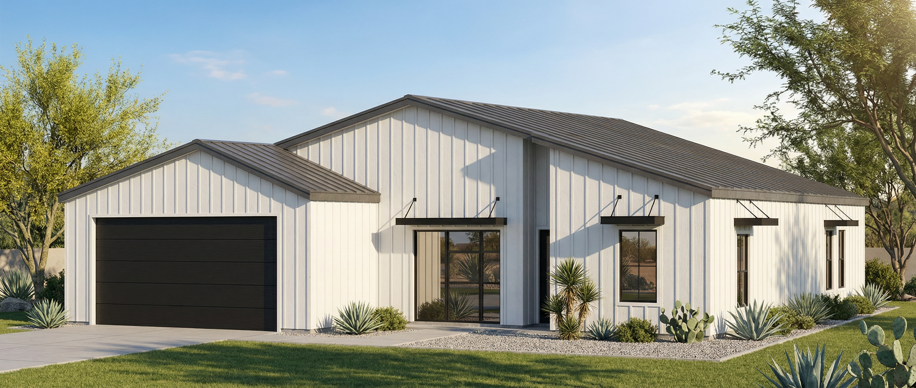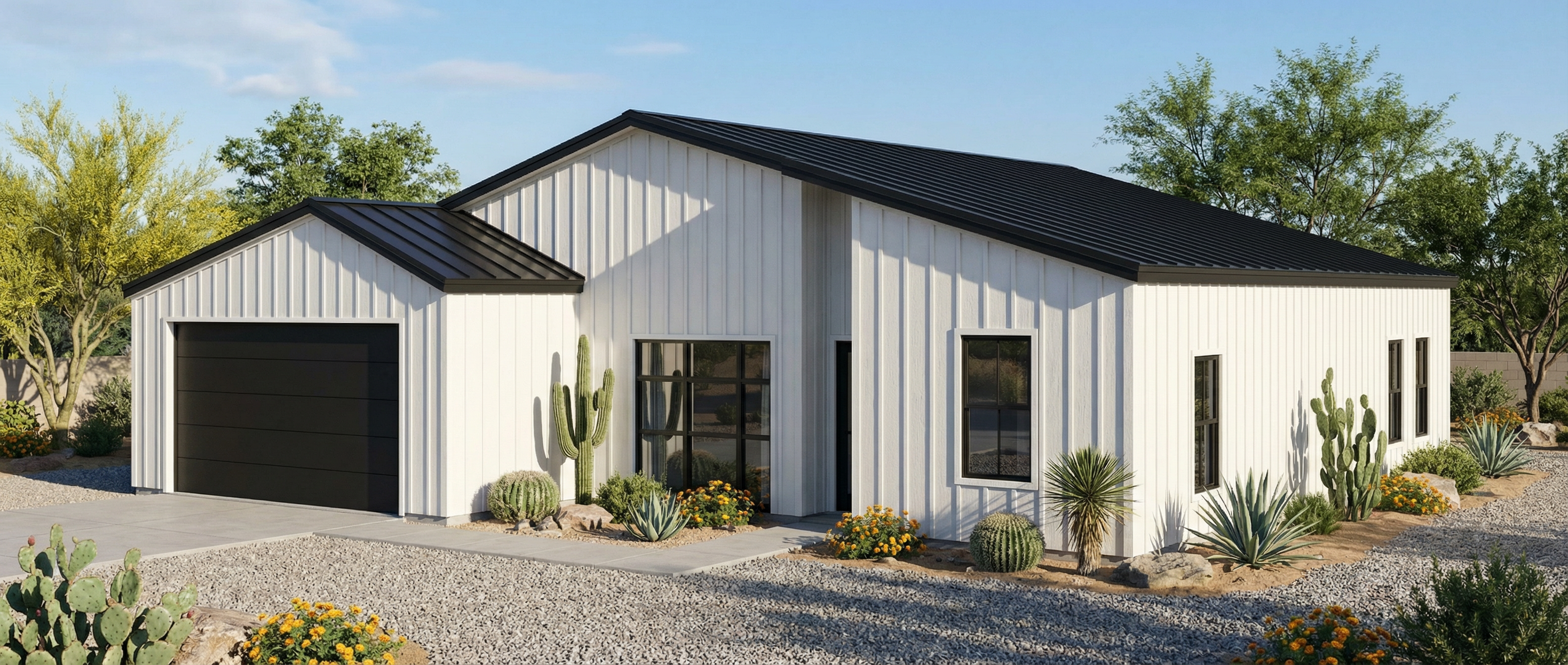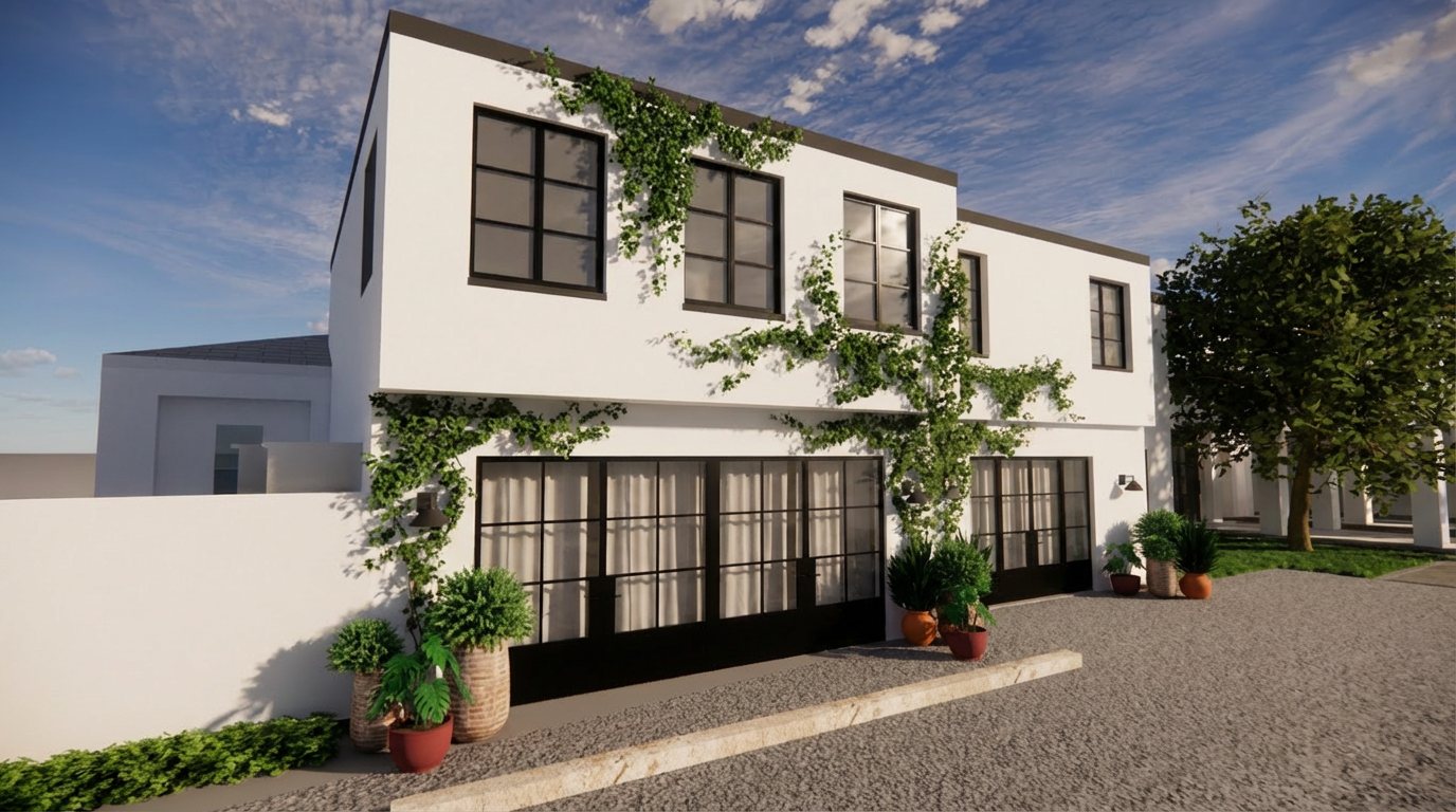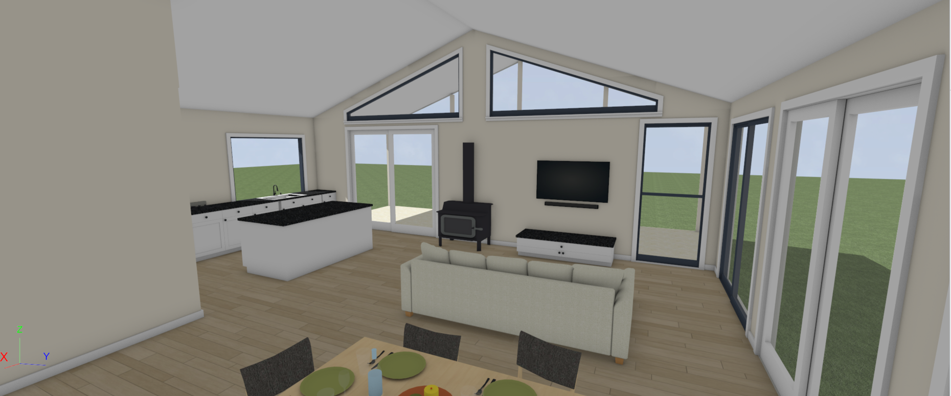 modernist exterior shot modern barn style open plan dining and living space with a vaulted timber ceiling exposed natural oak beams and tongue and groove timber ceiling panels light airy interior with soft neutral tones limewashed walls and wide plank oak flooring large black framed sliding glass doors along one side bringing in natural light minimalist european coastal aesthetic feature a long solid timber dining table with matching chairs soft linen textures and a subtle neutral rug in the background a built in dark navy or charcoal kitchen with open shelving styled with ceramics and greenery ceiling is the hero pitched roof with evenly spaced exposed beams warm natural timber clean architectural lines soft natural daylight warm tones editorial interior photography style high end residential design australian coastal barn aesthetic architecture