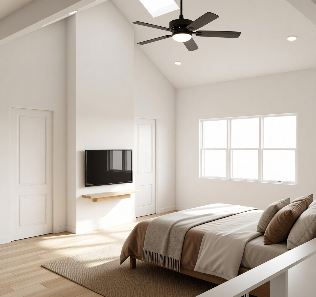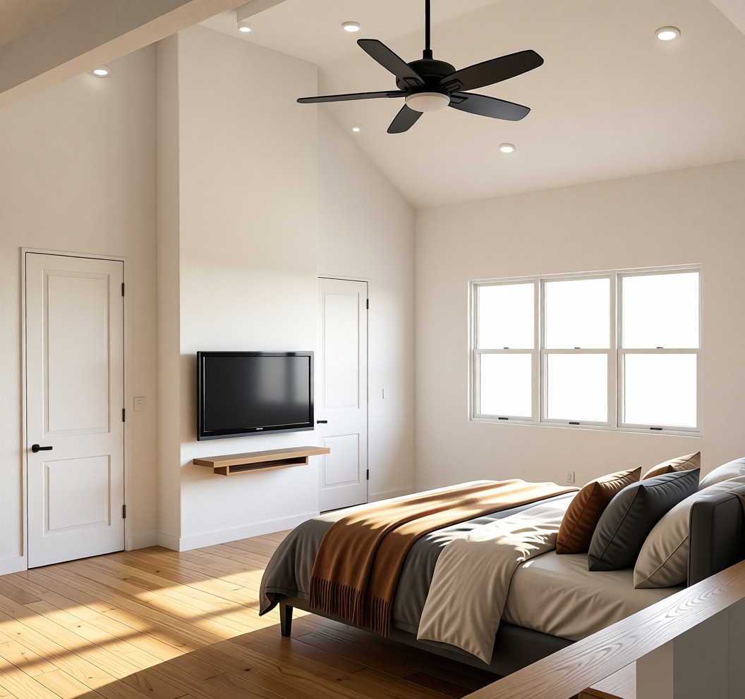 recessed lights furnished primary bathroom bright light coming in white walls white oak floors shower niche white matte tiles bronze fixtures