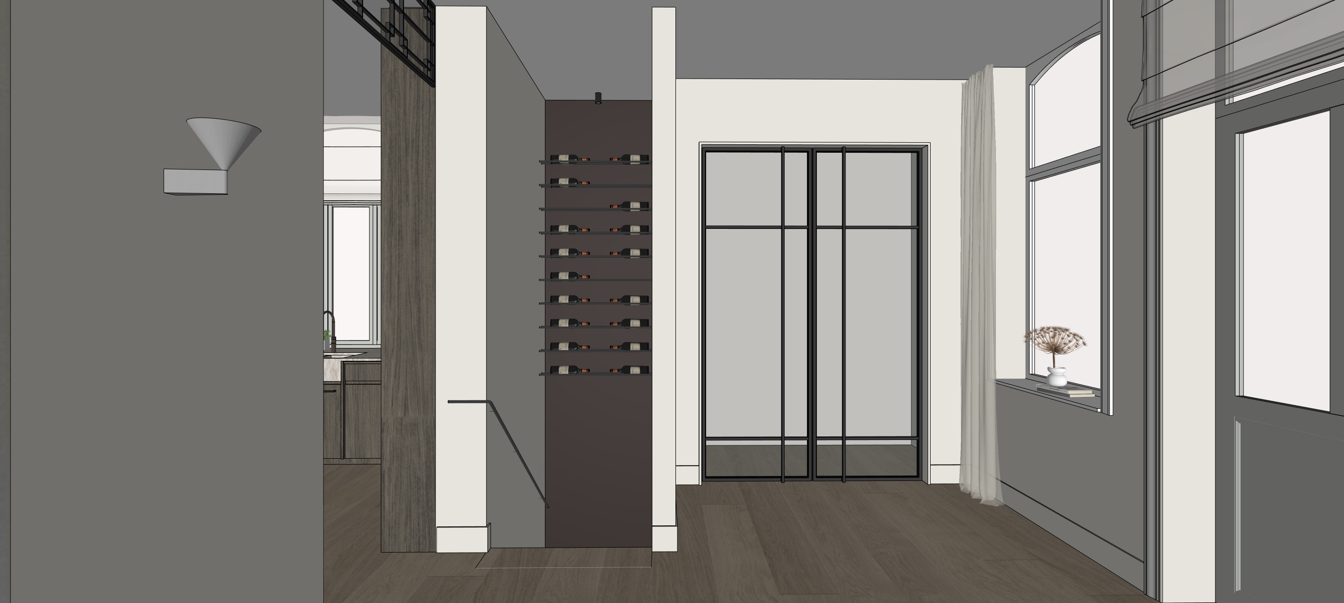 make this interior in sketchup photorealistic and add cathedral glass in the steel doors