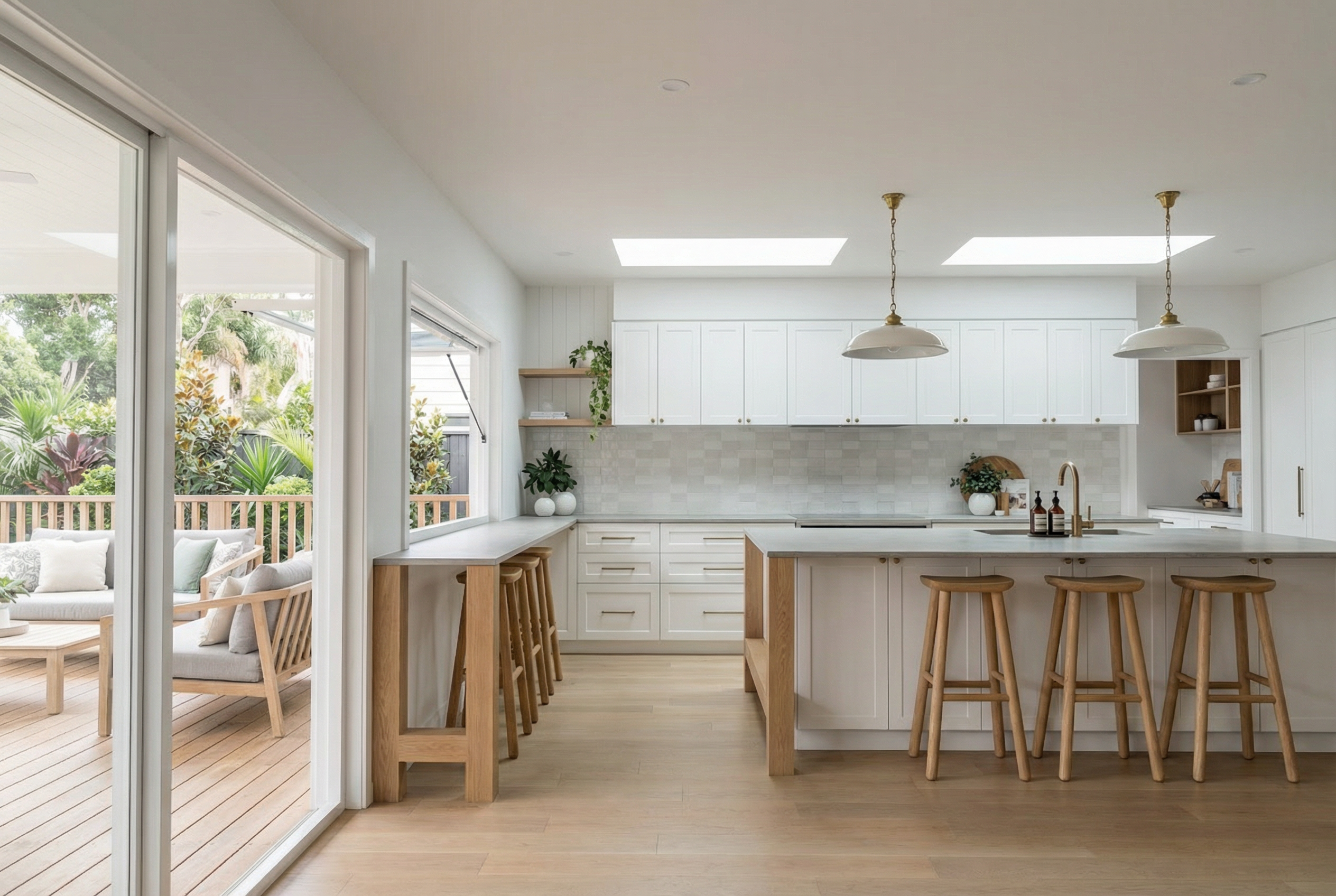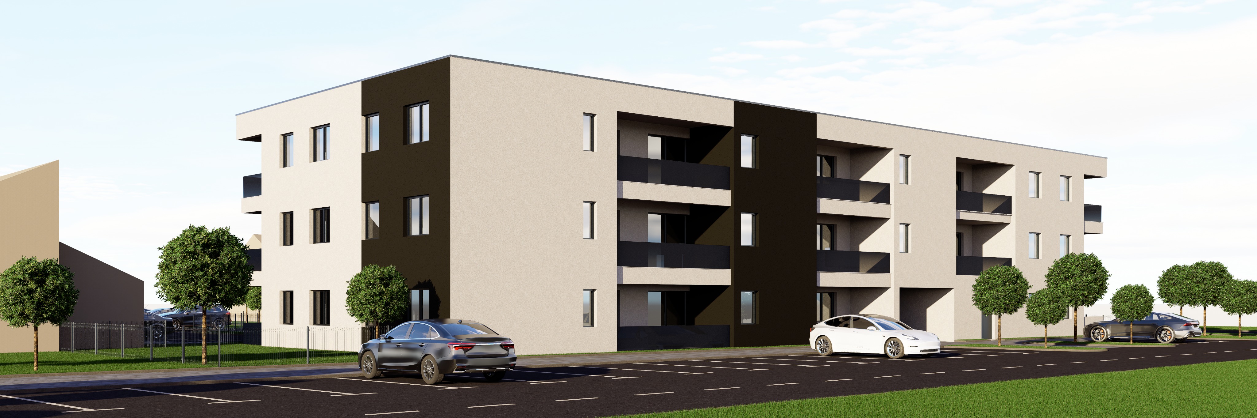 render a modern three story apartment building with a sleek design use a combination of light gray and dark charcoal gray for the exterior walls for a stylish contrast incorporate large windows reflecting the sky adding a sense of openness design the balconies with dark charcoal glass reflective railings and light gray surfaces surround the building with lush green lawns neatly trimmed the road in front should be a smooth asphalt with white markings set the atmosphere to a clear bright day with a vivid blue sky scattered soft clouds and gentle sunlight illuminating the scene keep the trees from the original model just enhance them a bit to be realistic the render should be ultra realistic do not change the shape and characteristics of the building