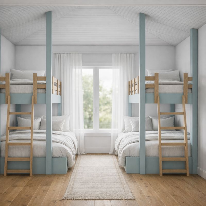 exterior shot keep the bed sizes and window size accurate according to the model but change the finish details to feel more like a beach vacation rental