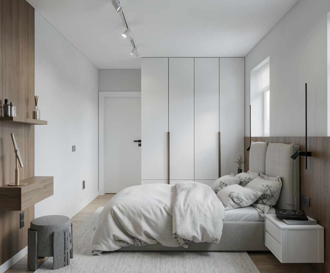 illumination in the interior as on a cloudy day transform the input interior design photo into a hyper realistic architectural visualization of a contemporary modern interior preserve exact geometry layout proportions and material intent from the original design lighting create soft overcast daylight atmosphere similar to a cloudy rainy day without visible rain with diffused natural light entering maintain balanced contrast no harsh shadows no overexposure materials textures enhance material realism micro details surface imperfections soft reflections accurate roughness physically correct light response emphasize textures wood grain fabric weave concrete metal and matte finishes high micro contrast and tactile depth rendering style ultra photorealistic architectural visualization cinematic quality natural color grading neutral tones soft highlights realistic global illumination physically based rendering high dynamic range premium interior photography style camera composition wide angle architectural lens natural perspective eye level viewpoint deep focus sharp details across the frame natural framing no distortion atmosphere calm elegant contemporary premium residential mood clean minimal refined without visual noise output 8k resolution ultra detailed noise free crisp edges professional architectural rendering quality white sockets do not add any led lighting straight ahead on the left side is a white door with a frame szafa jest kolorze bia ym ciany s bia e negative prompts no rain droplets no lens flares no fog no haze no bloom no motion blur no cartoon no stylization no oversharpening no artificial glow no unrealistic reflections no distortion no clutter no led lighting no window