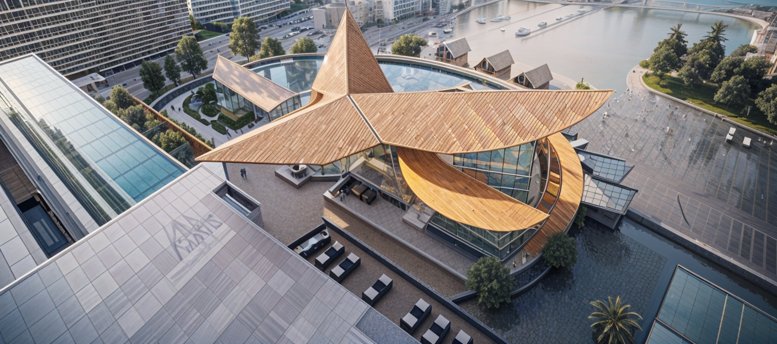 exterior shot realistic natural scene building in lake around with grass field roof shingle rood wood color add grass green color around roof light grey color architecture
