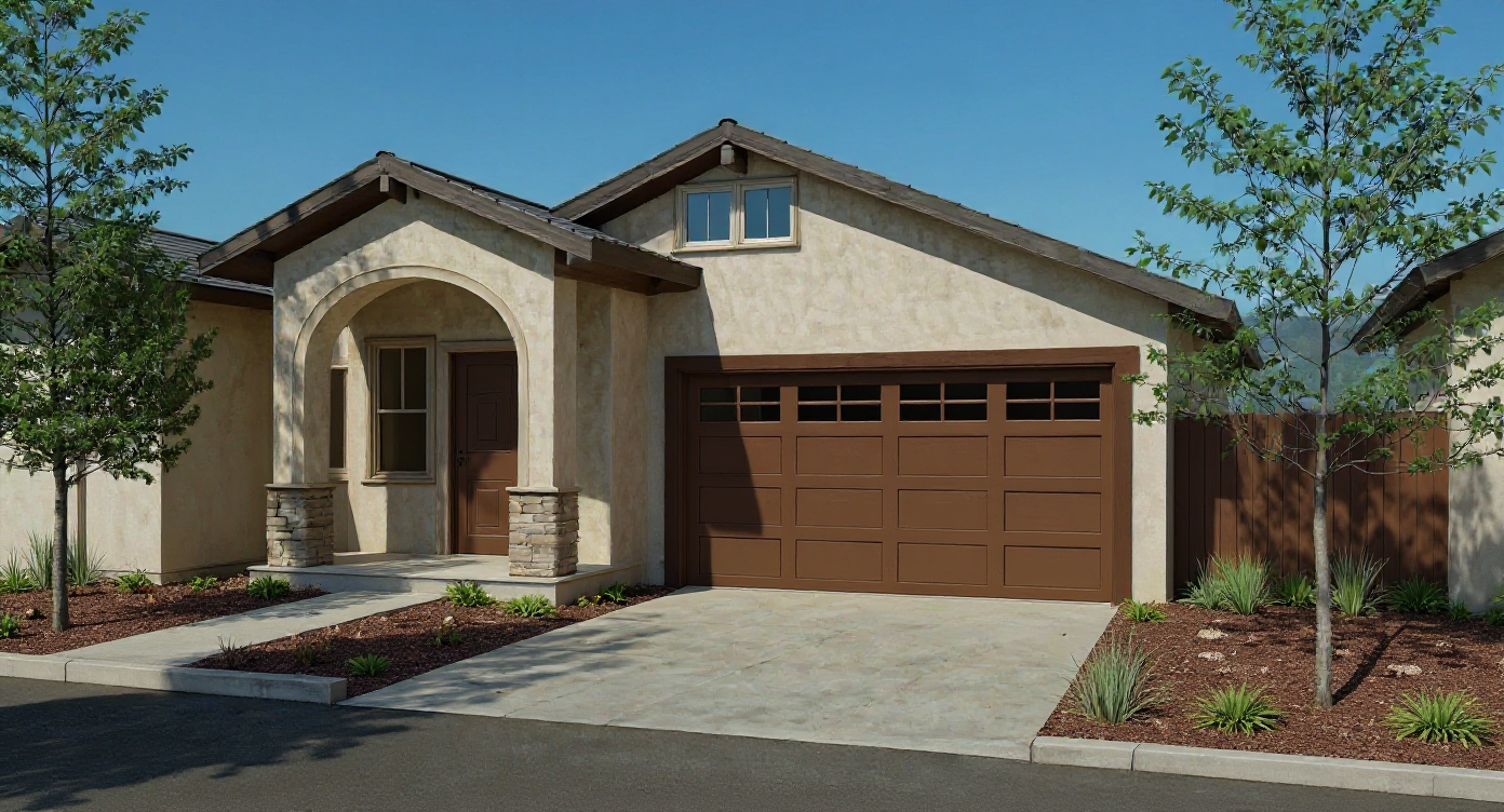 enhance the scene with have photorealistic materials and keeping the original colors the atmosphere should be serene and inviting with a bright blue sky filled with soft fluffy clouds add low lying landscape native shrubs in green areas