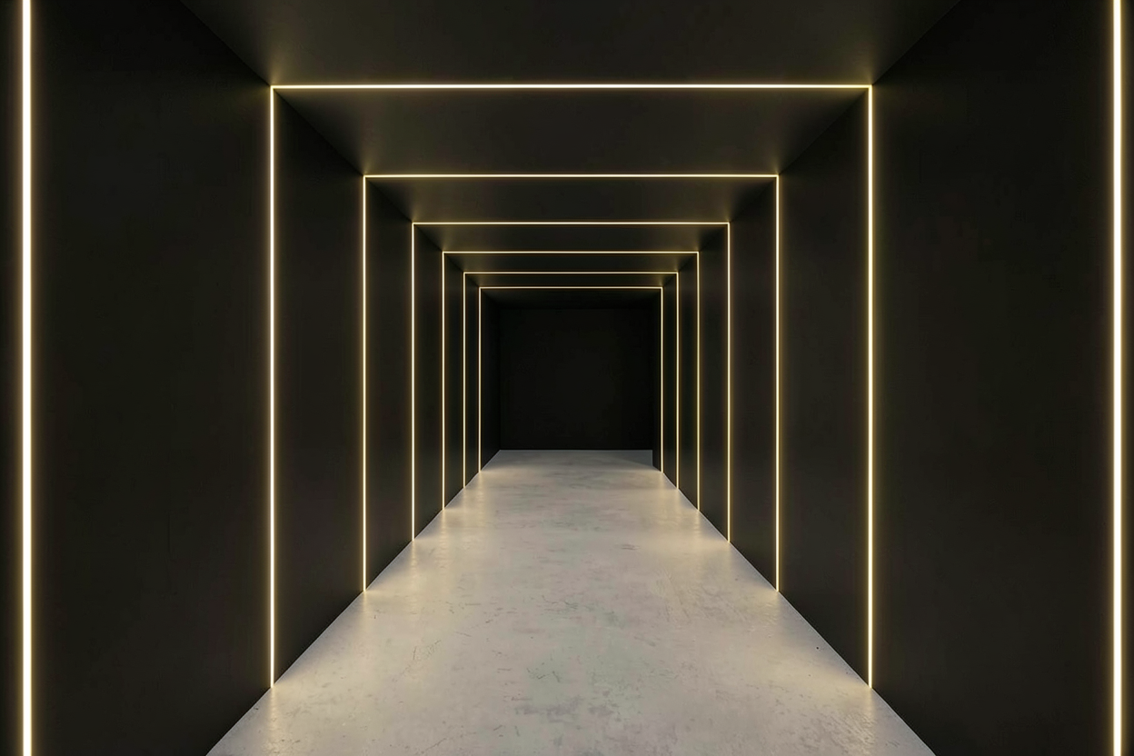 a mysterious tunnel with smooth matte black walls and ceiling illuminated by thin glowing yellow lines at equal intervals creating a geometric pattern the floor is a smooth textured dark gray concrete adding a subtle contrast the scene should be set in a moody atmospheric lighting conveying an air of intrigue and modernity