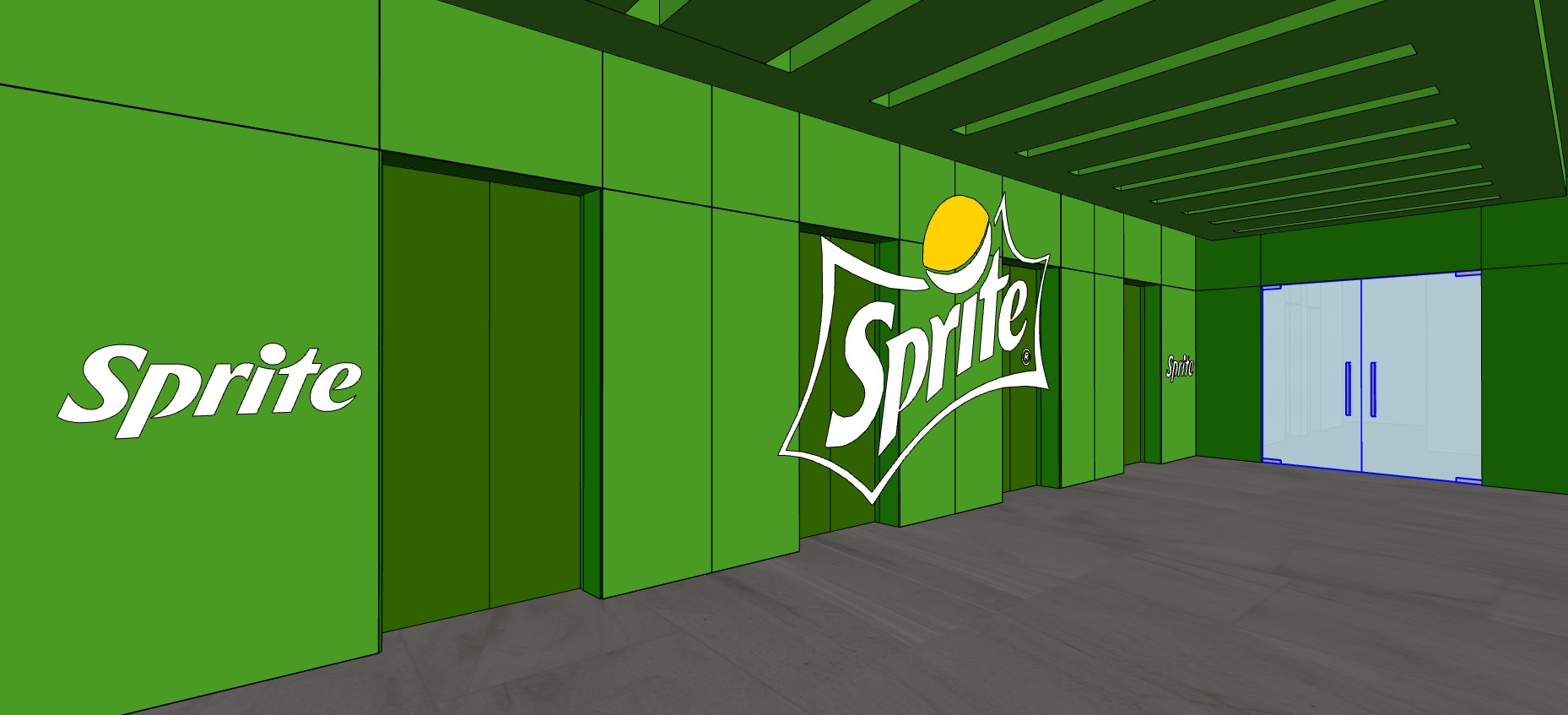 an elevator lobby with matte green board walls the floor is made of beige marble the elevator doors are finished with green sticker paper a white sticker is draped on the elevator walls like a sticker the ceiling is a green painted drop ceiling with cove lighting on both sides above the elevator doors and recessed pin lights in the middle a glass door is at the end of the hallway