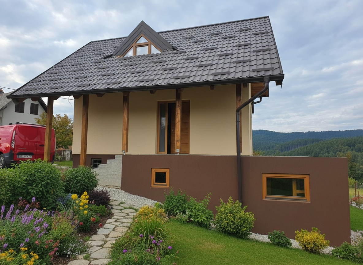 stairs in brown facades add a black railing with vertical bars on the stairs and in the extension of the terrace