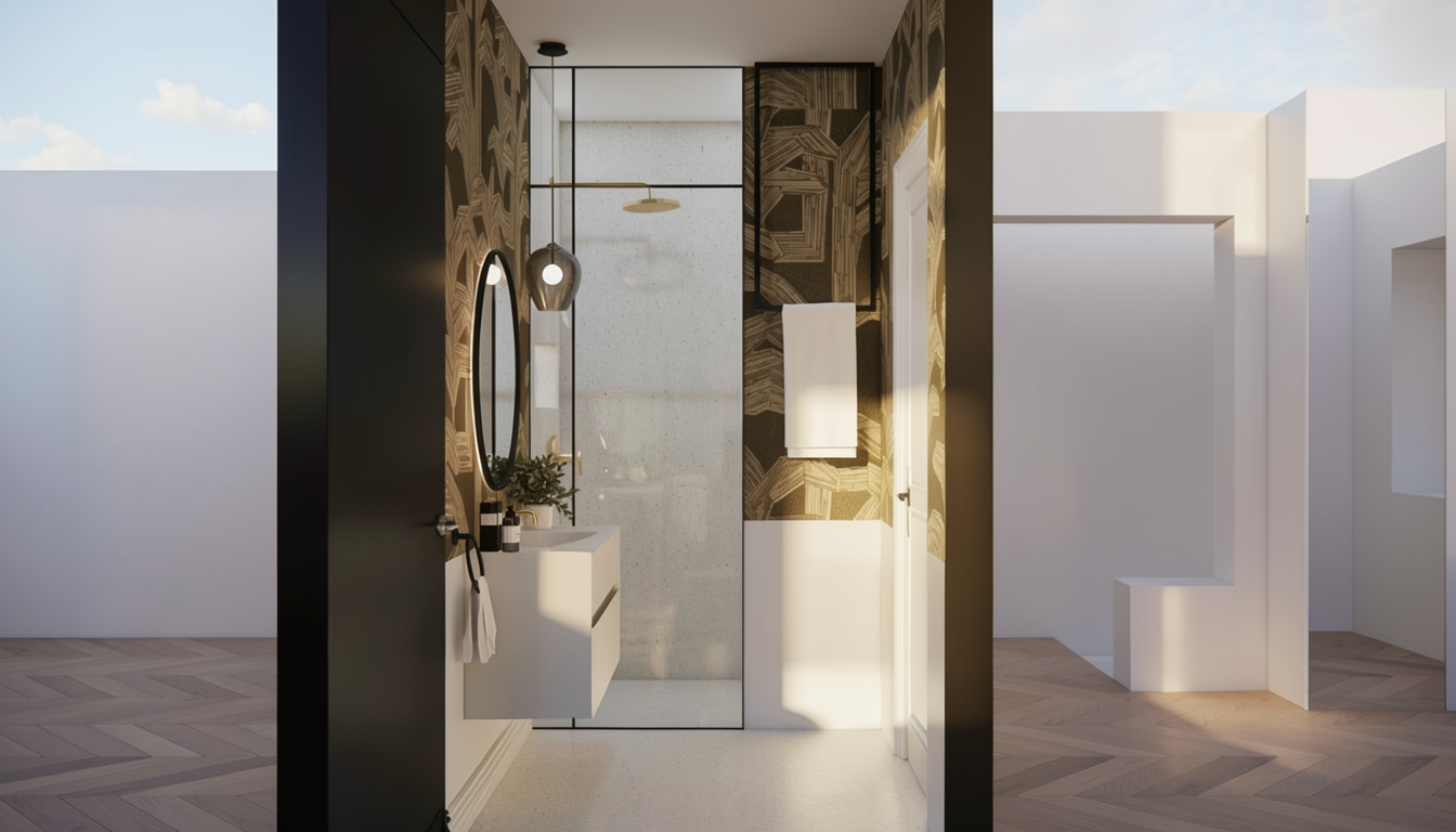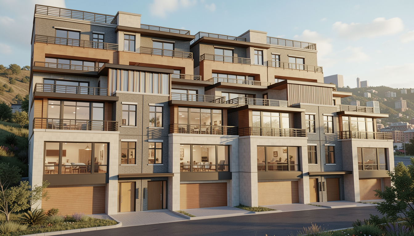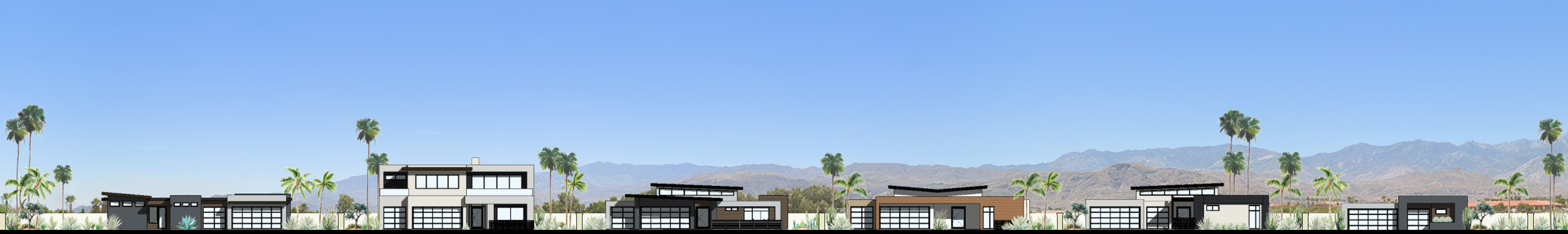 palm springs background sun setting behind mountains faint glow of porch lights faint glow of living spaces behind windows frosted glass on garage doors