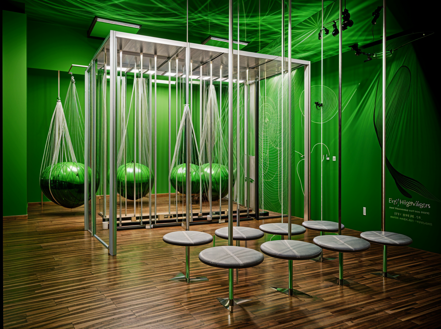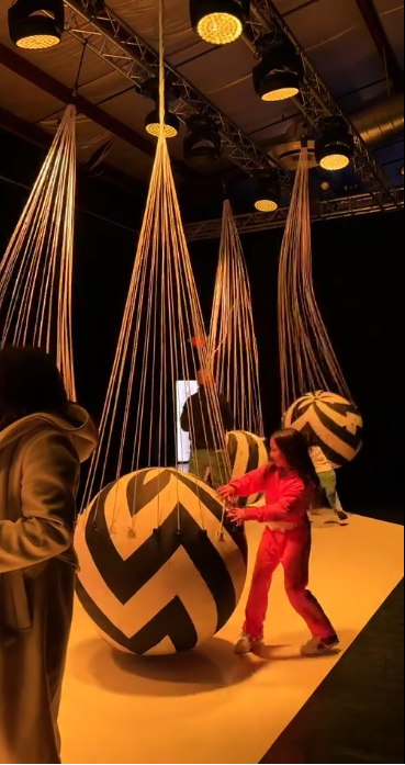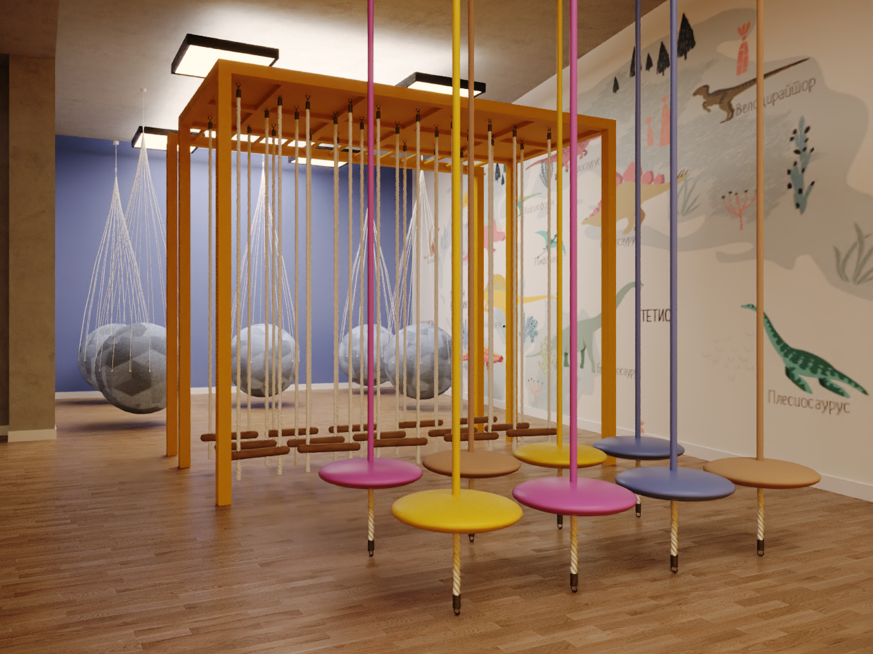 interior shot instalations for playing for kids big balls in the back used for pushing and playing