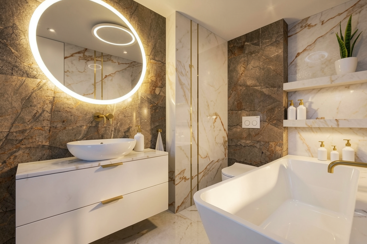 photorealistic interior architectural visualization of a high end hair salon walls and built in cabinetry finished in little greene portland stone deep muted olive green left side feature wall visible through bronze window frames finished in little greene attic ii 144 dark grey blue flooring transition foreground in therdex c15055 rustique dark wood pvc background in beige fine grained terrazzo styling chairs upholstered in verotex barbuda pro 24 light blue fabric with transparent plexiglass armrests floating vanities in light grey beton cire cabinetry details in pava lavasteen monza wood ceiling in light concrete look finish with white track lighting and white spotlights black minimalist wall sconces black vertical metal pole on the left white electrical sockets flat even studio lighting no dramatic shadows high detail textures 8k resolution crisp lines