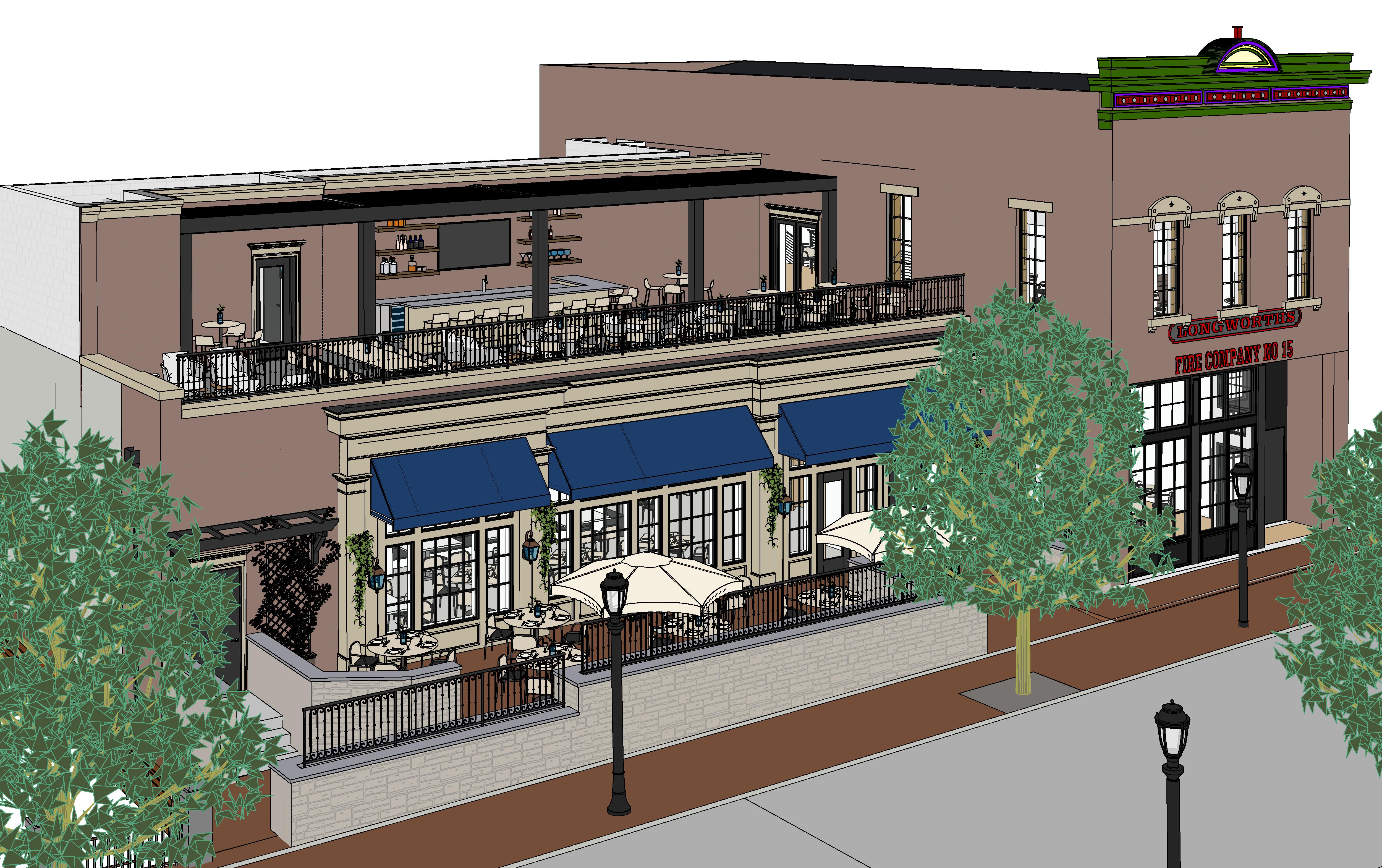 strict maintain exact building geometry massing proportions openings materials layout and camera perspective from the input revit model do not alter structure roofline window door locations patio layout or site walls project adaptive reuse of historic firehouse longworth s fire company no 15 in mount adams cincinnati ohio preserve entire existing structure including original firehouse and rear addition material intent all primary wall surfaces are existing red brick matching the reference photo aged cincinnati brick varied tone subtle weathering cream tan elements are painted exterior trim only window surrounds cornice banding not stucco or eifs no new wall materials introducedcontext match reference image closely sloped mount adams street condition with slight uphill grade brick paver sidewalk at building frontage low stone retaining wall with iron railing above mature street trees partially obscuring fa ade important adjacent buildings tight to sides urban hillside fabric black street lamps subtle historic character parallel street parkingsite patio maintain raised patio condition exactly as modeled black metal railing at patio edge outdoor dining with neutral umbrellas and simple furniture clean but slightly lived in not staged or perfect architecture details preserve historic firehouse fa ade proportions and detailing signage integrated cleanly no oversized or fake signage large storefront glazing at ground level with realistic reflections upper windows maintain original proportions and trimlighting early evening golden hour warm interior lighting visible through windows soft exterior accent lighting on brick and signage natural shadows consistent with street treesatmosphere photorealistic grounded true to life cincinnati urban hillside environment slight depth haze no stylization no exaggerated effectsdo not do not suburbanize the setting do not add parking lots or open space do not change materials do not clean up or modernize surrounding buildings excessivelycritical preserve all awnings exactly as modeled in geometry size projection and placement awnings are high end fabric canvas in a deep navy midnight blue tone almost black in low light matte finish with very subtle texture no gloss fabric is clean and tightly stretched with minimal sag crisp edges and refined proportions color should remain consistent across all awnings lighting creates soft natural gradients across the fabric surface with slight warmth from nearby lighting do not change awning shape remove them or alter their alignment add curated restaurant patio landscaping inspired by upscale european style outdoor dining incorporate a mix of planters medium and large round planters in neutral tones light stone terracotta off white ceramic dense green shrubs and small ornamental plants with natural variation climbing vines trained vertically along wall surfaces between windows subtle not overgrown planter placement along patio edges near railing between window bays to soften fa ade rhythm near entry points and corners for layeringvegetation style lush but controlled well maintained not wild mix of leafy greens with varied sizes and textures slight natural asymmetry for realismdo not block major architectural elements or signage maintain clear circulation paths