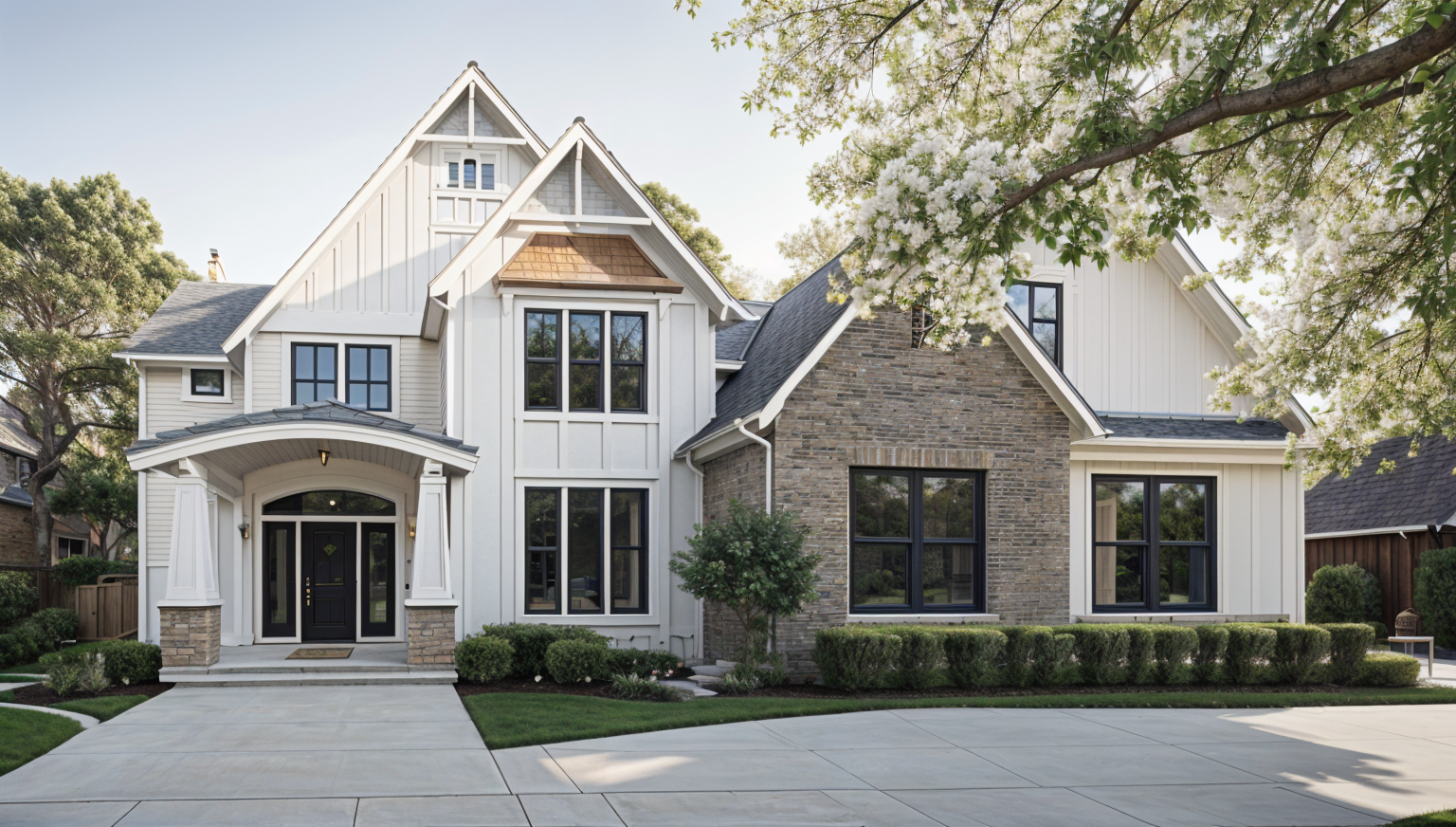 colonial revival exterior shot the exterior is painted white brick the shutters are a light grey the roof is a dark grey slate the windows are white there is an opening in the front for a part a cache architecture