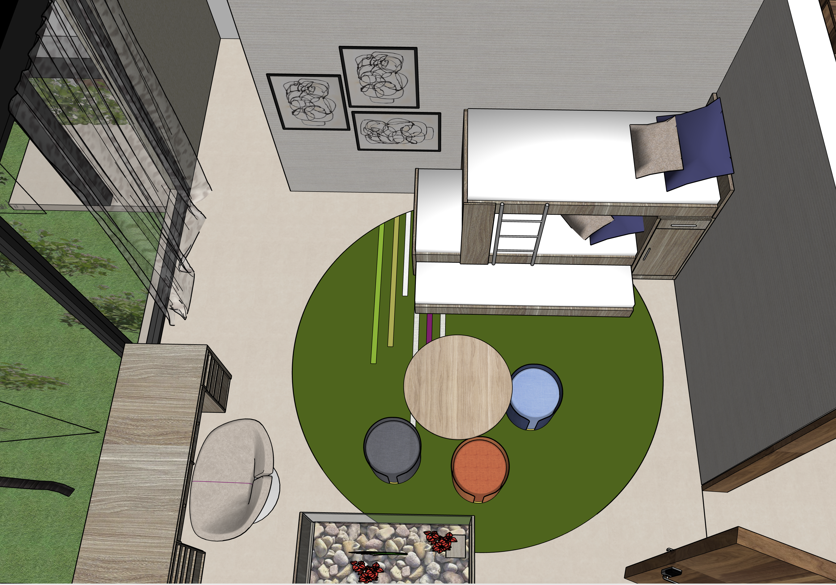 view from a kid bedroom in minimalist contemporary residential beige color large scale ceramic linen wall papers sheer curtain light wood color bunk bed study desk in light wood color fish tank small colourful chairs round green rug with some colourful stripe under the bed and the central round table and 3 chairs