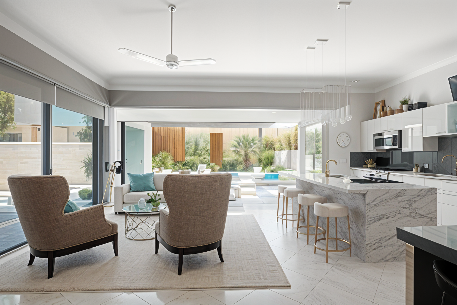 modern exterior shot modern exterior shot black and concrete buildings with black roofs rectangular pool and fire pit in center black fences lush tropical greenery in background grass and smooth porcelain floor architecture