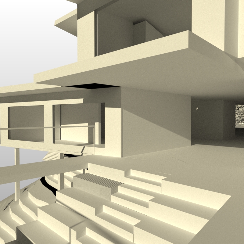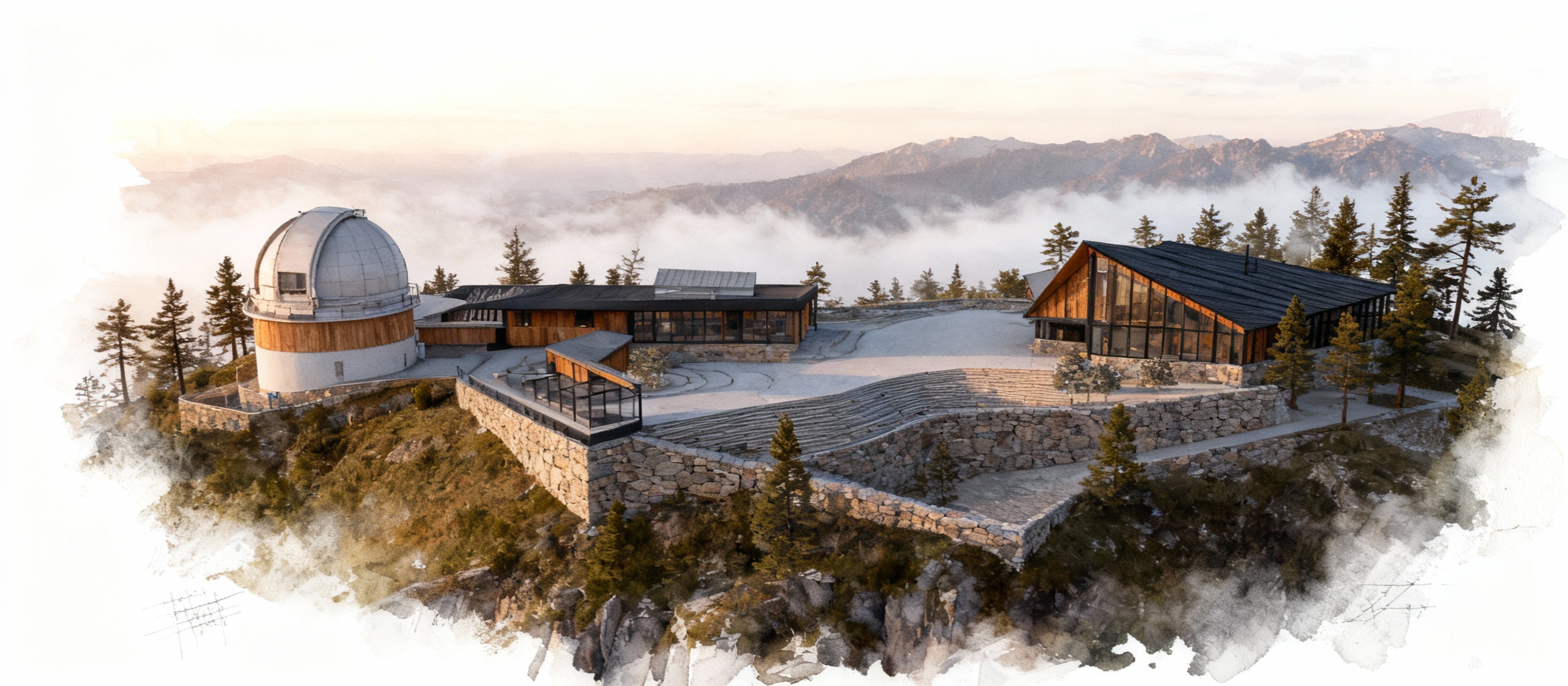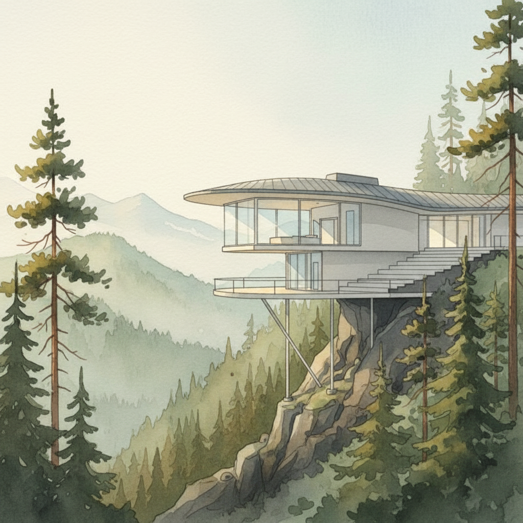 exterior render of a modern distant misty green and brown mountains the building features smooth walls large glass windows the structure extends over a steep forested green and brown slope supported by slender columns soft morning light filters through the mist creating a calm and airy watercolor illustration aesthetic with pastel tones gentle shadows and a paper textured finish