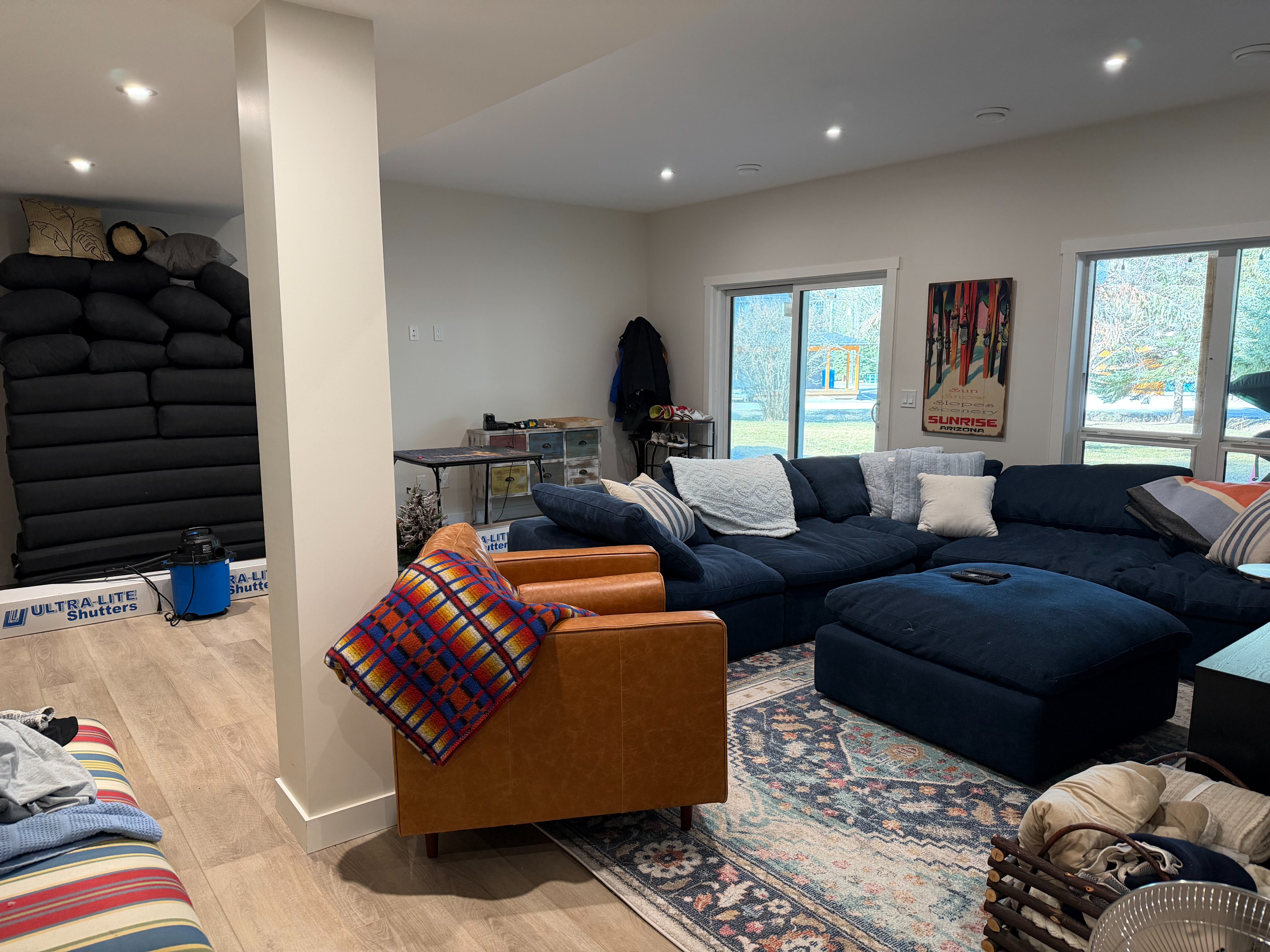 clean up the room and straighten out the blankets and cushions on sectional and chair remove outdoor cushions in the back corner