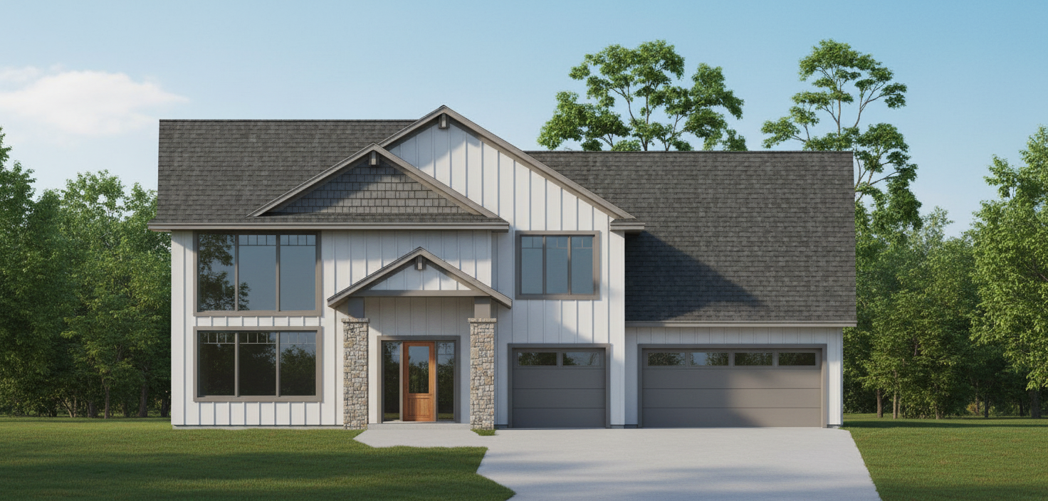 render a beautiful suburban house with modern architectural details the exterior walls are painted in a soft creamy white with subtle texture the roof features dark gray shingles adding a classic touch windows are framed with a sleek black finish providing contrast against the light colored siding the front door is a warm wood tone inviting and sophisticated the garage door mirrors the main color scheme maintaining consistency and elegance the stone accents around the entrance are in shades of light gray enhancing the modern look surrounding the house are lush vibrant green trees with full foliage creating a serene and inviting atmosphere the driveway and pathway are paved with light gray concrete cleanly guiding the viewer s eye to the entrance the scene is set in a clear sunny day casting gentle shadows and highlighting the textures of the materials the overall atmosphere is calm and welcoming reflecting a contemporary suburban lifestyle