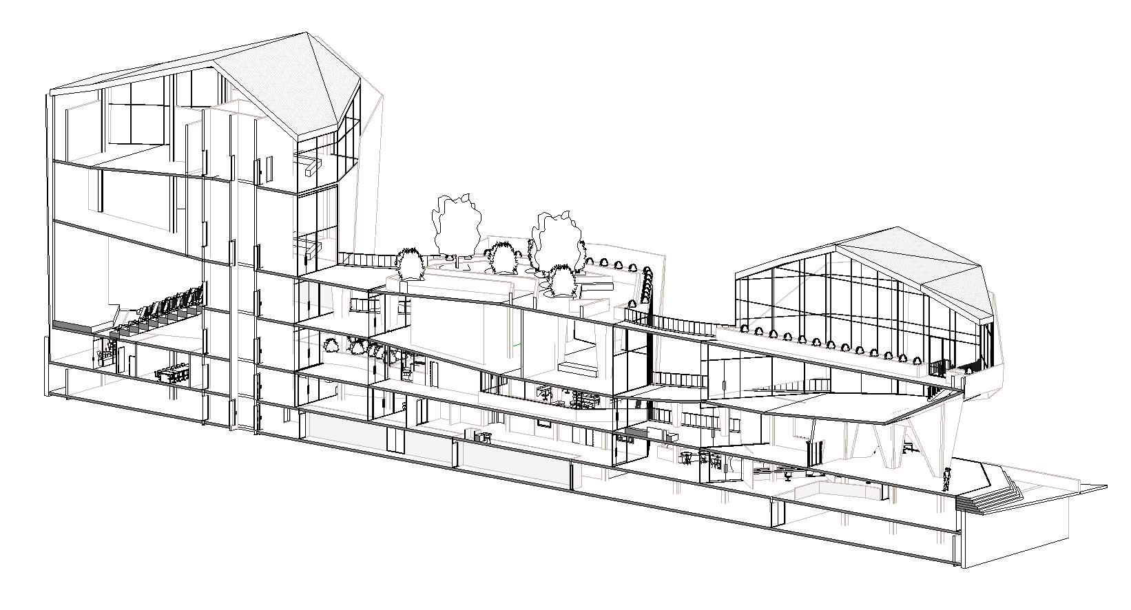 render this cross section perspective view exactly as is in black and white add black and white people to the view architecture