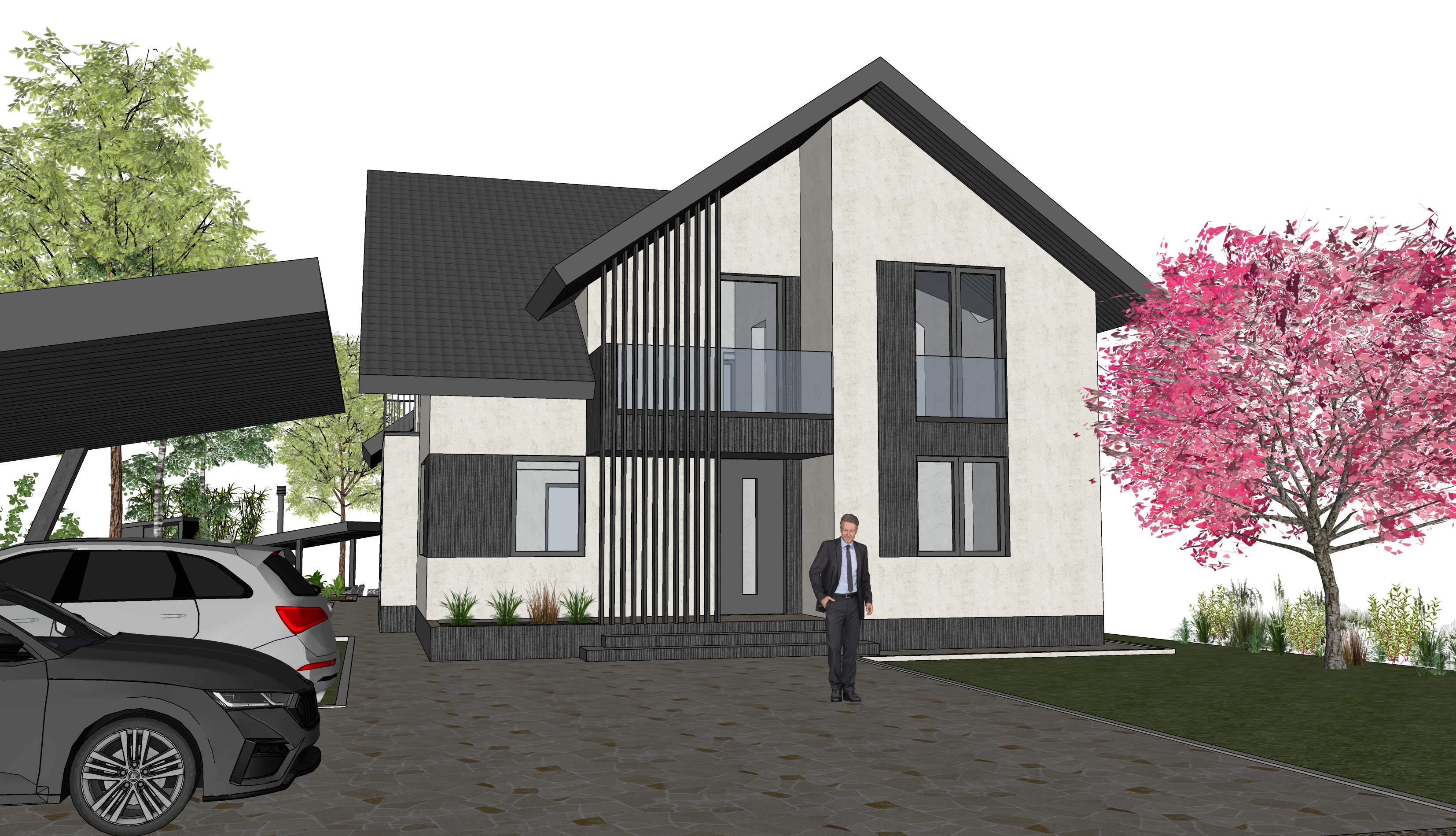 exterior sunny image of a modern house with plaster facade and antracite insertions reflective glass of the windows keep the glass handrail in front of the upper right window