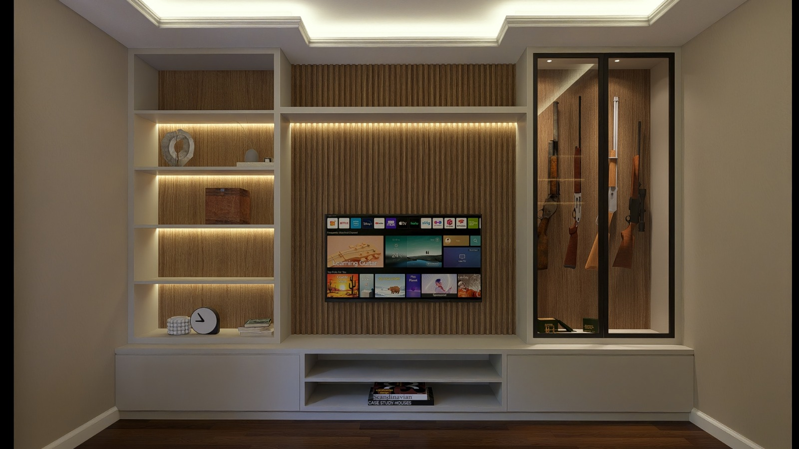 luxurious home office interior with modern minimalist design warm and inviting atmosphere built in shelves with soft ambient lighting showcasing neatly arranged books and decorative accents elegant desk with a sleek computer setup cozy brown chair adds a touch of sophistication soft beige and cream wall colors accented by dark brown curtains large window letting in natural light enhancing the airy feel white sofa with a geometric pattern perfect for relaxation overall color palette includes warm browns soft whites and subtle earthy tones