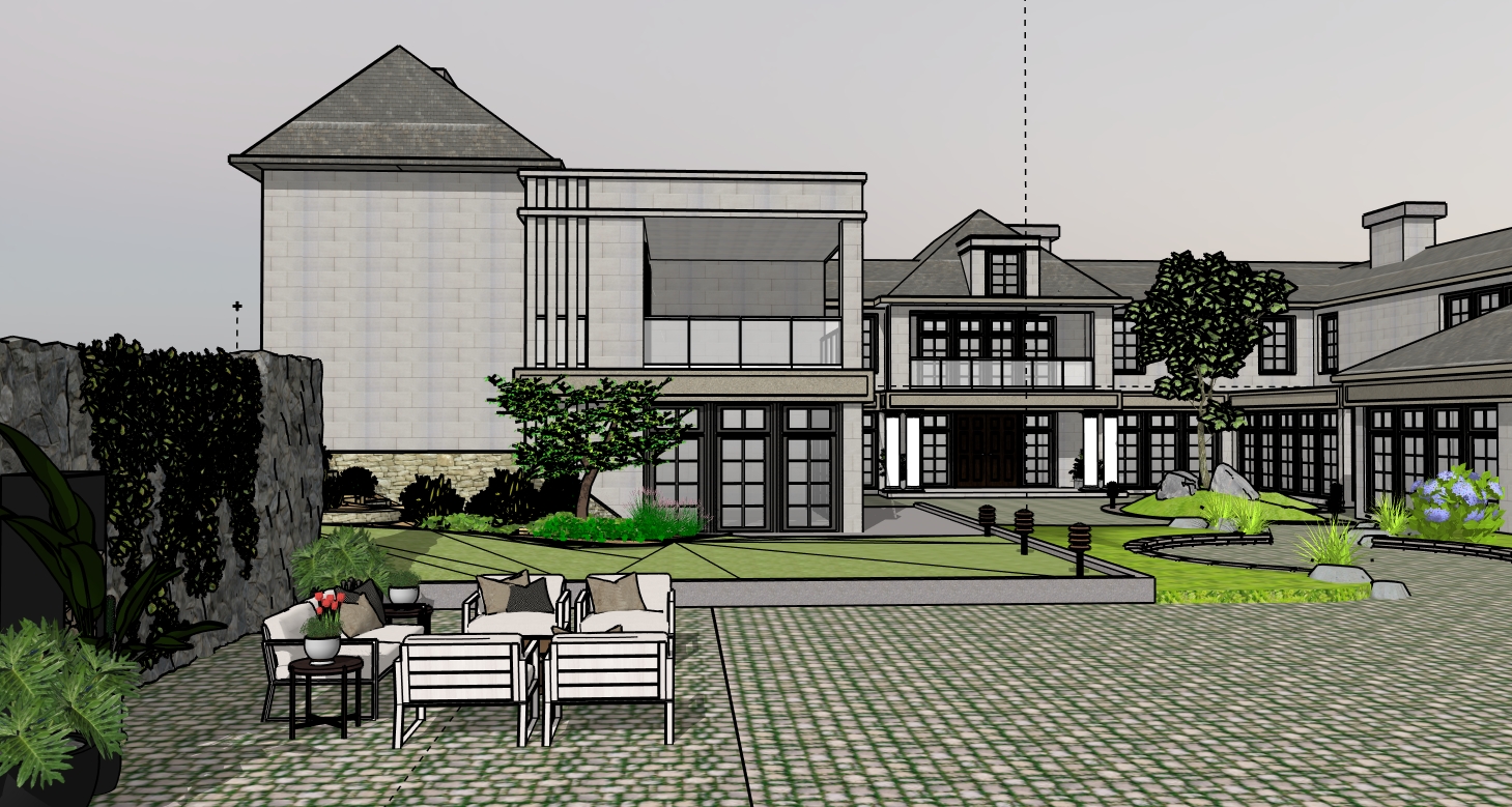 spring time almost evening harp lights black frames trees more realistic at the background show different height of trees inside the buildings show furniture the windows are darker the lights in landscape should be realistic and metal material show real lightings below the roof gables and landscape lights