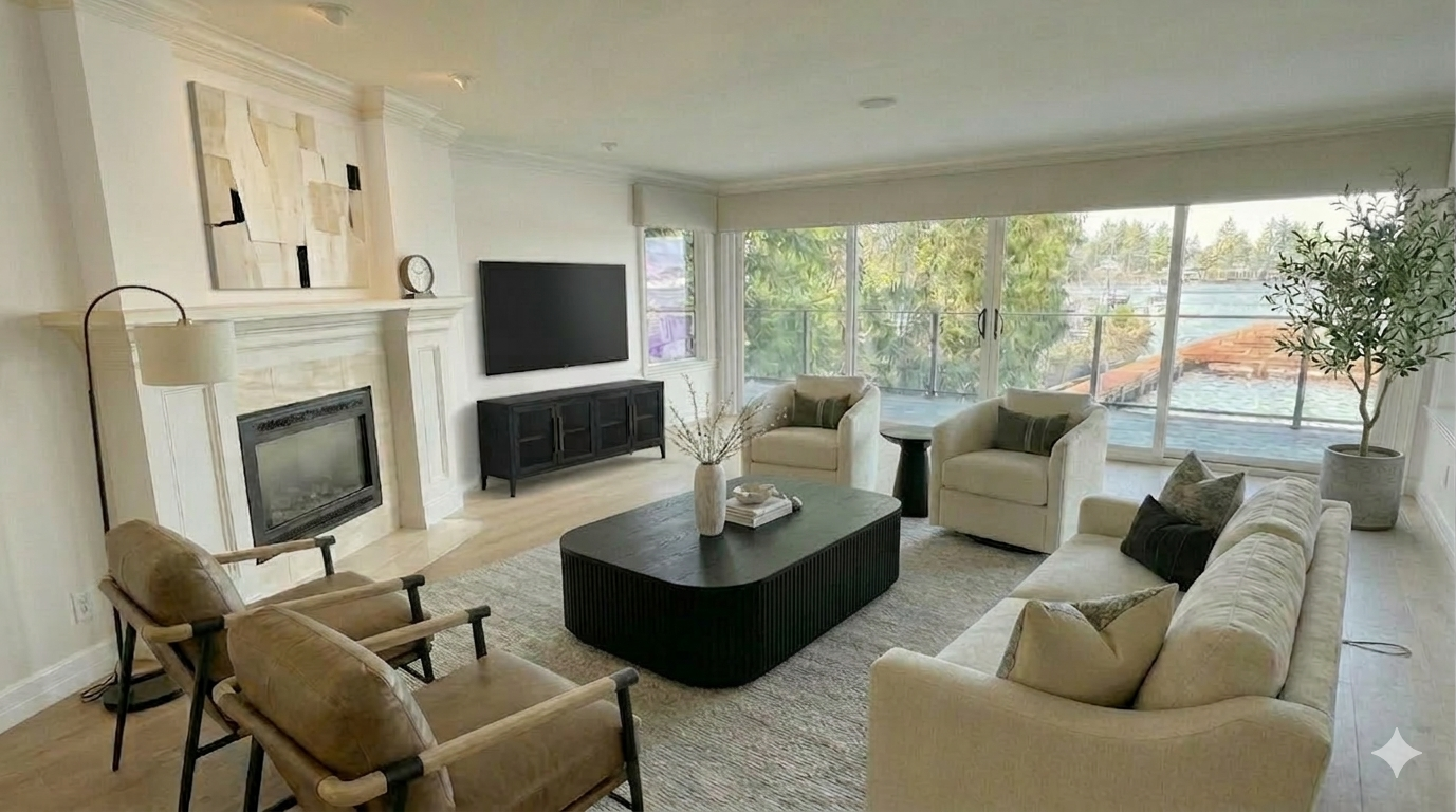 change the art above the fireplace to be in a modern black frame add some modern classic decor to the fireplace mantle remove the valences above the windows do not change or reinterpret anything else in this space do not change the structure or the walls