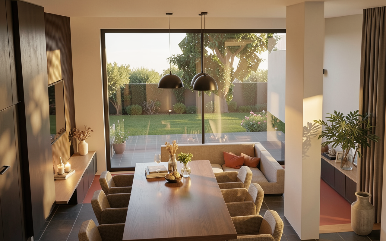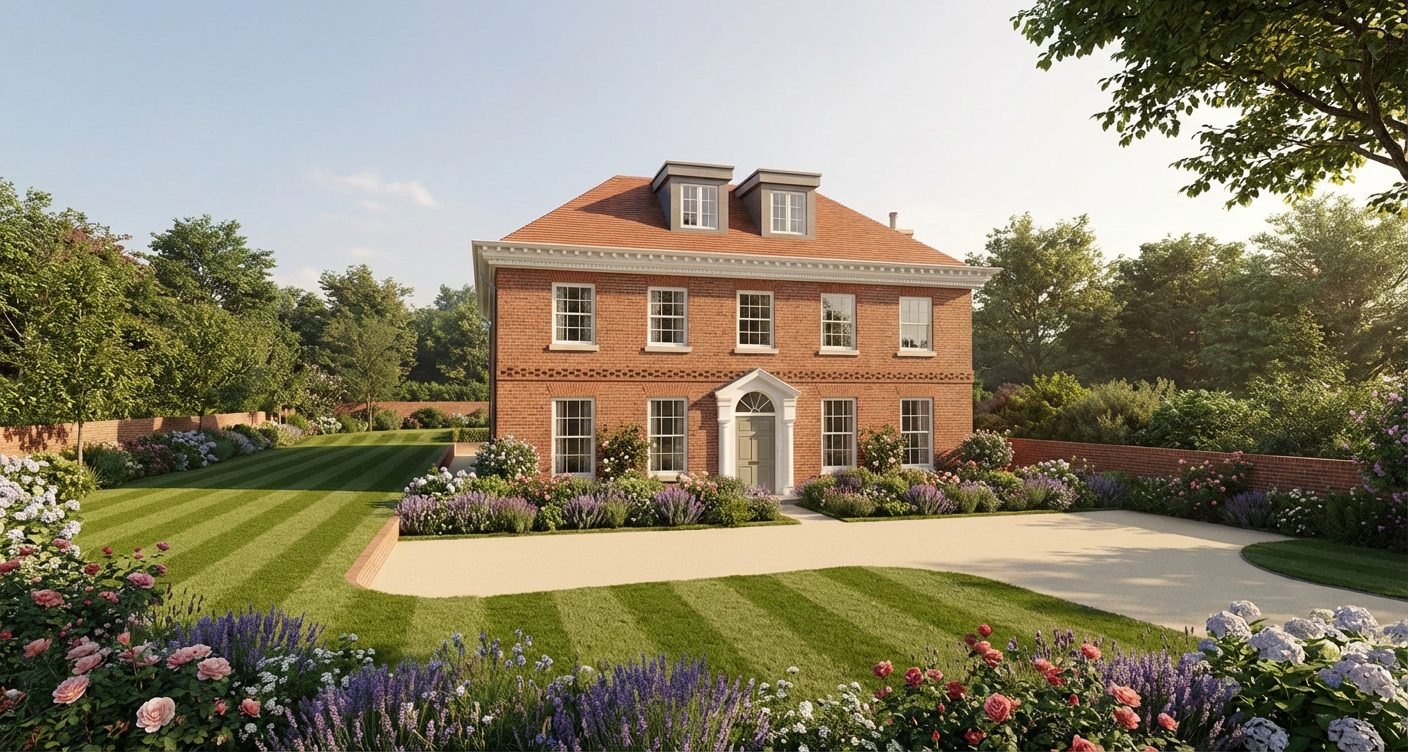 sunshine mowed gras light in windows settlement in background